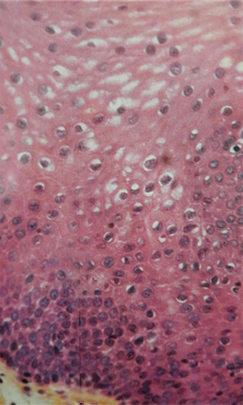 Fig. 1-8. (a,b) Papilomatose vestibular. (c) Aspecto microscópico da papilomatose vestibular. Verifica-se papilomatose, acantose e paraceratose focal. As células podem ter um halo perinuclear que corresponde a vacúolos de glicogênio que mimetizam coilócitos.