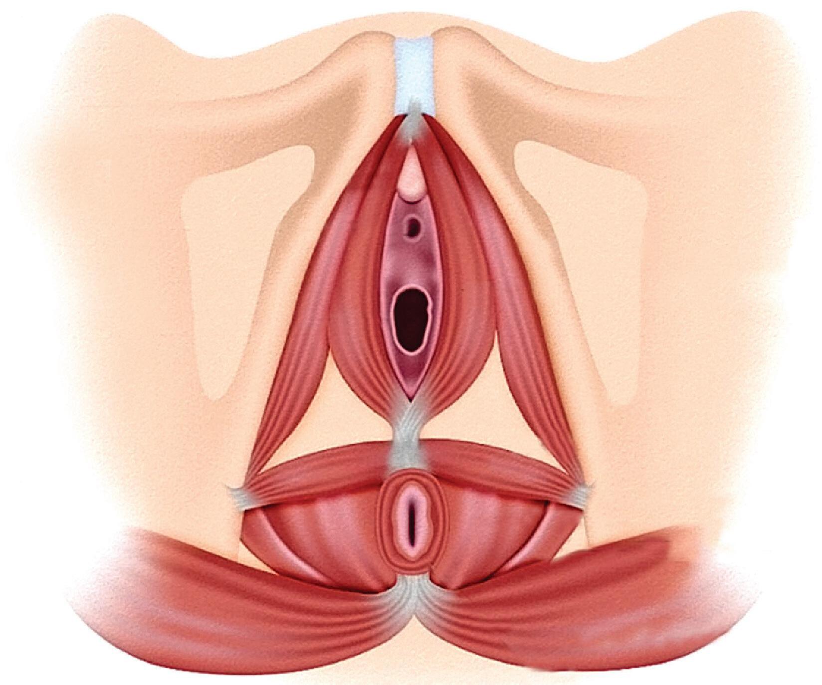 períneo, o ísquio cavernoso e o bulbo cavernoso, os profundos são o transverso profundo e o esfíncter externo da uretra. No triângulo urogenital estão incluídas as estruturas genitais externas e a abertura uretral. Estas estruturas externas cobrem os espaços superficial e profundo do períneo que formam a vulva (Fig. 1-10).