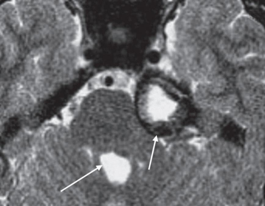 1-12. Sequência volumétrica. Sequência axial volumétrica: liquor com sinal hiperintenso (seta curta), sétimo e oitavo nervos cranianos na cisterna do ângulo pontocerebelar (seta longa).