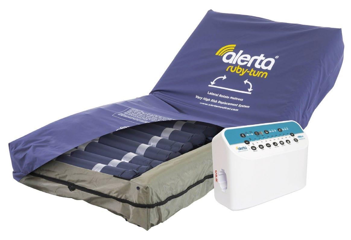 The Alerta Ruby Turn is a lateral turning full replacement alternating pressure relieving mattress system with cell-oncell air cells, a static base section and an in-use height of 8" for effective prevention and treatment of users at very high risk of developing a pressure ulcer in hospital, nursing and care home environments. It features a multi-stretch vapour PU cover and ultra-silent pump operation.