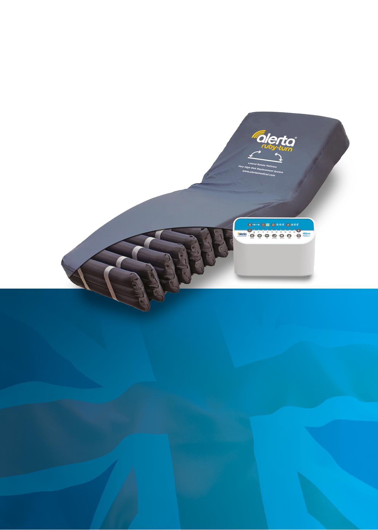 ALT-9450 - Alerta Ruby Turn – a lateral turning full replacement alternating pressure relieving mattress system with cell-on-cell air cells, a static base section and an in-use height of 8” for effective prevention and treatment of users at very high risk of developing a pressure ulcer in hospital, nursing and care home environments.