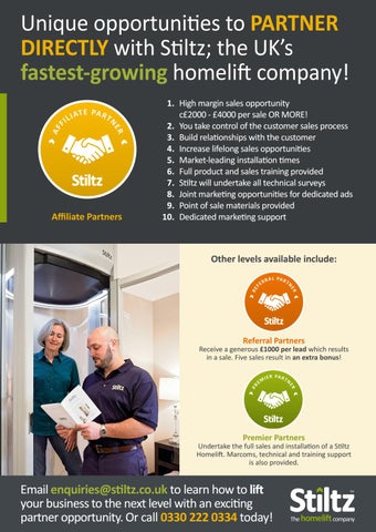 1. High margin sales opportunity c£2000 - £4000 per sale OR MORE! 2. You take control of the customer sales process 3. Build relationships with the customer 4. Increase lifelong sales opportunities 5. Market-leading installation times 6. Full product and sales training provided 7. Stiltz will undertake all technical surveys 8. Joint marketing opportunities for dedicated ads 9. Point of sale materials provided 10. Dedicated marketing support