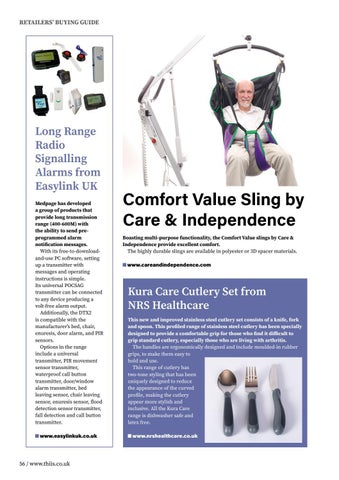 Long Range Radio Signalling Alarms from Easylink UK Medpage has developed a group of products that provide long transmission range (400-600M) with the ability to send preprogrammed alarm notification messages. With its free-to-downloadand-use PC software, setting up a transmitter with messages and operating instructions is simple. Its universal POCSAG transmitter can be connected to any device producing a volt-free alarm output. Additionally, the DTX2 is compatible with the manufacturer’s bed, chair, enuresis, door alarm, and PIR sensors. Options in the range include a universal transmitter, PIR movement sensor transmitter, waterproof call button transmitter, door/window alarm transmitter, bed leaving sensor, chair leaving sensor, enuresis sensor, flood detection sensor transmitter, fall detection and call button transmitter. www.easylinkuk.co.uk