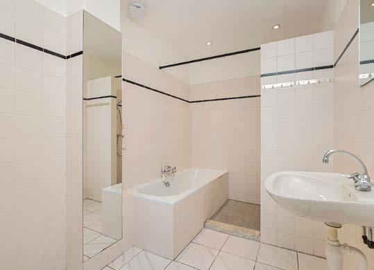 Betegelde badkamer met ligbad, separate douche en wastafel met toebehoren. Aansluiting wasmachine.