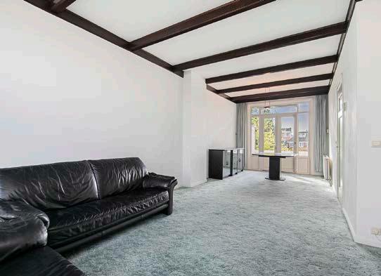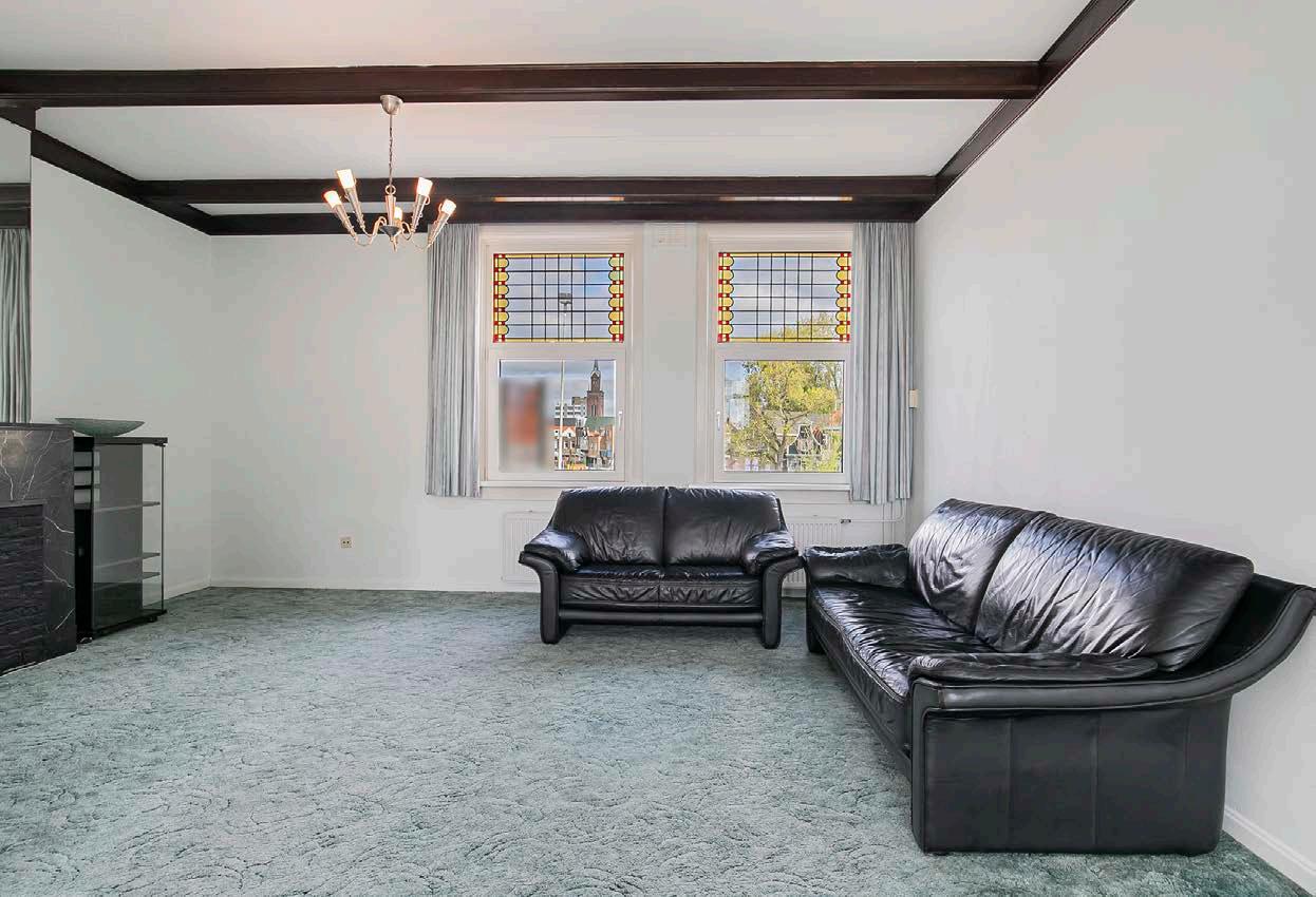 Doorzonwoonkamer met balkenplafond en marmeren (!) schouw. Voor bovenlichten met glas-in-lood (met voorzetglas ter verduurzaming). Achter dubbele openslaande deuren met boven- en zijlichten. Inpandig balkon op het zuidoosten.