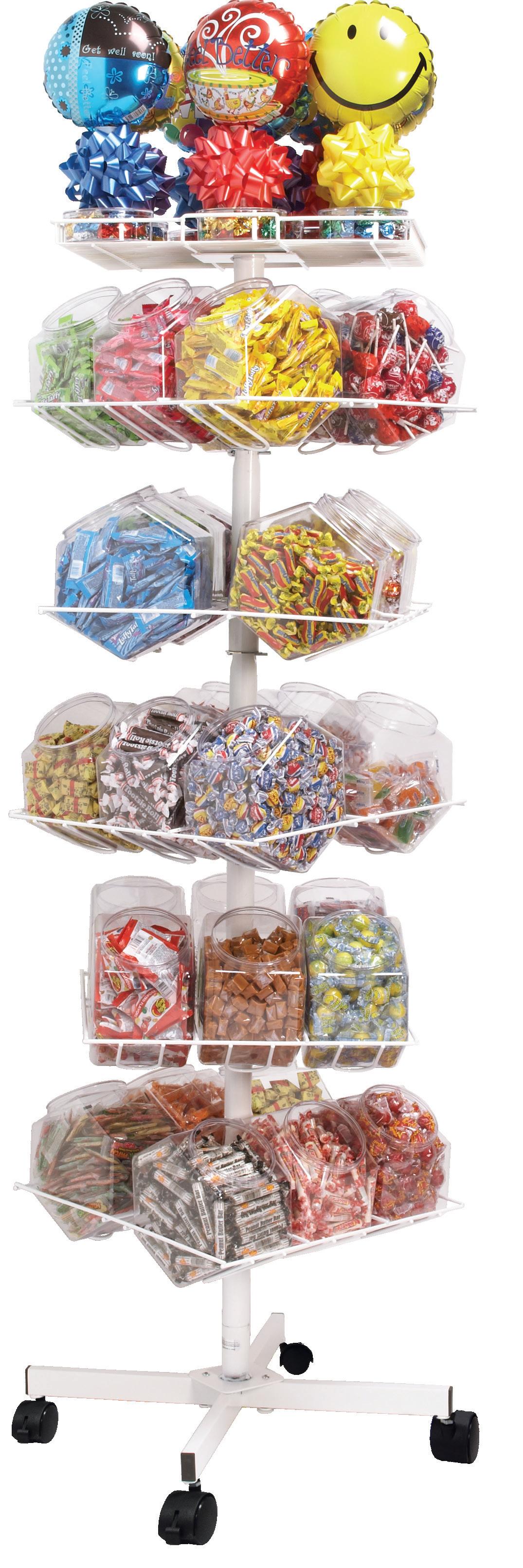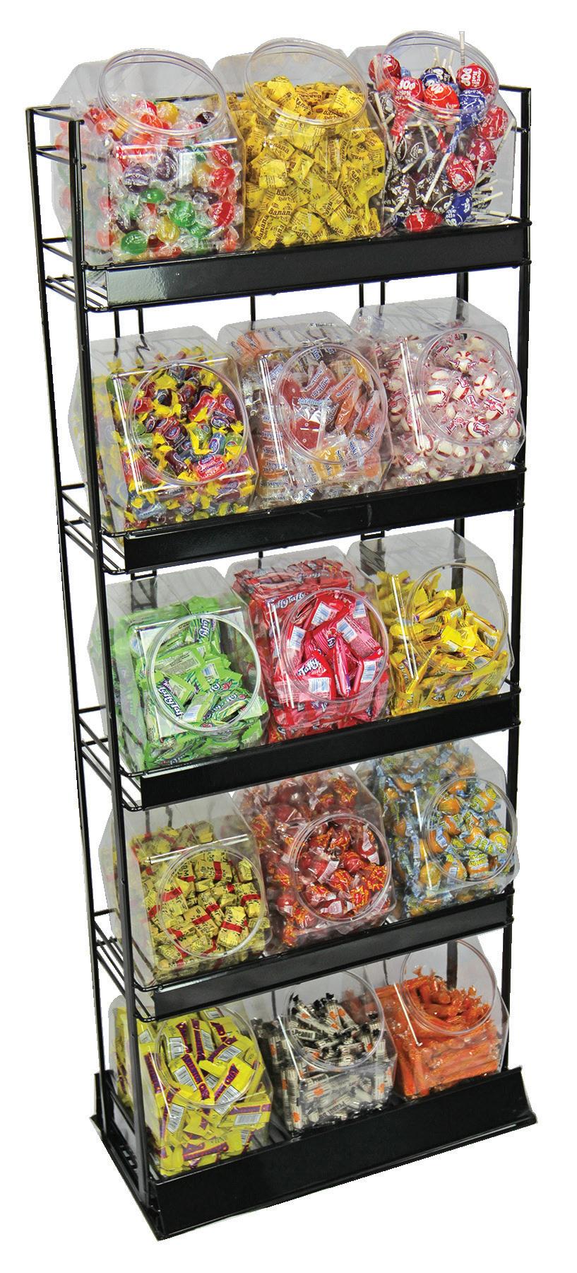 This metal display stands upright and can fit in a small space or up against a wall. The display holds 15 tubs and measures 183/4" W x 8" D x 461/2" H. Assembly required. This display and tubs typically sell for $275.00, but are yours for free with the purchase of 15 candy tubs.