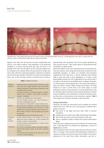 approximately 50% of patients and will be quickly perforated by heavy bruxism activity.16 Hard acrylic splints or thermoformed hardsoft splints are a better choice. Hard acrylic splints can be very frustrating and time consuming to fit. There are, however, some things that can be done to make this a more predictable procedure. As splints are essentially hard prostheses supported by hard tooth tissue, a silicone impression with medium body or putty and wash is more appropriate, as it makes a more dimensionally accurate cast. This is particularly the case where there is no facility in the practice to immediately pour an alginate impression. To avoid excessive occlusal adjustments in the second molar region, a hard wax record in centric relation should also be taken. The splint should be at least 1.5-2mm thick in the molar region to avoid perforation or fracture in heavy bruxists. It is almost always better to ask for a flat plane splint instead of one with occlusal indentations. Anterior ramps are added by some practitioners to exclude the posterior teeth, but these have not been proven to be necessary or superior. Table 3 shows options for restoration materials in cases of bruxism.
