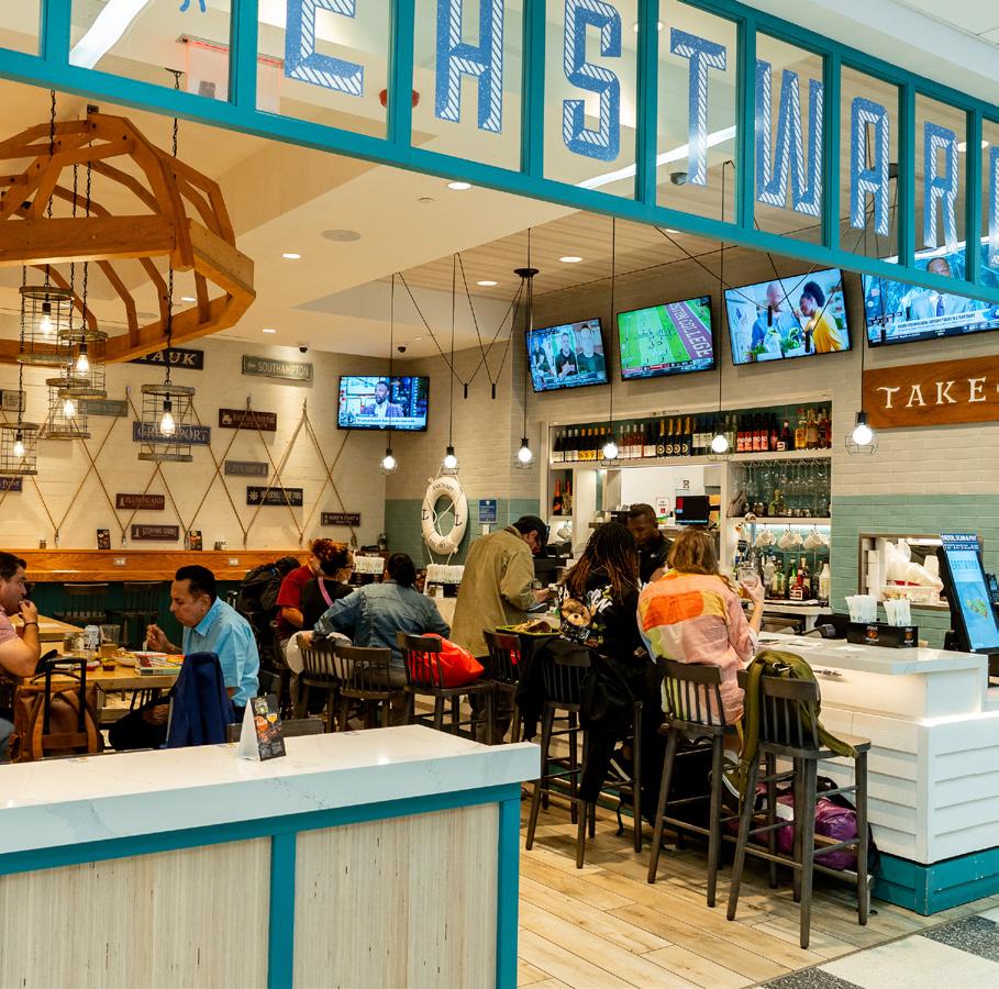Eastward Long Island Kitchen is a love letter to New York. There are signs letting passengers know that Montauk, Sag Harbor, and more local spots are nearby. The decorative buoys never let one forget they’re on Long Island. The lights hanging from the ceiling look like lanterns keeping a sailor safe on a pier of yesteryear. The food menu is seafood-forward, as any island menu should be, and the full bar keeps travelers coming back for more.