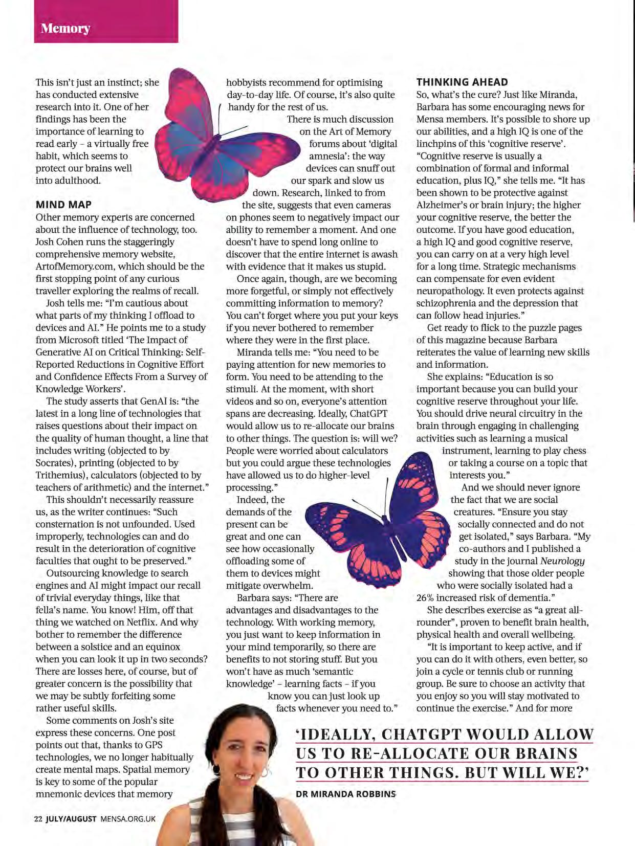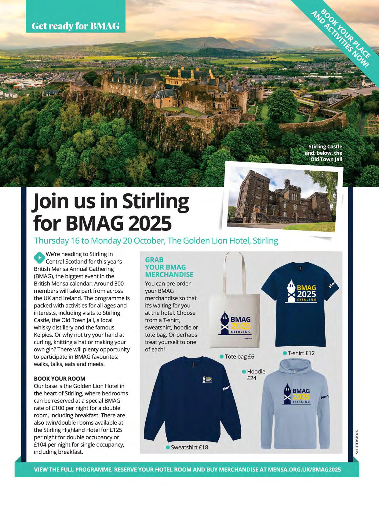 Finally, don't miss the advert for the 2025 British Mensa Annual Gathering (BMAG)taking place this October in Stirling, Scotland. Always a highlight of our calendar, visit mensa.org.uk/BMAG2025 to view the programme and book your place. A preview of what our fantastic volunteer team has in store will feature in the next issue.