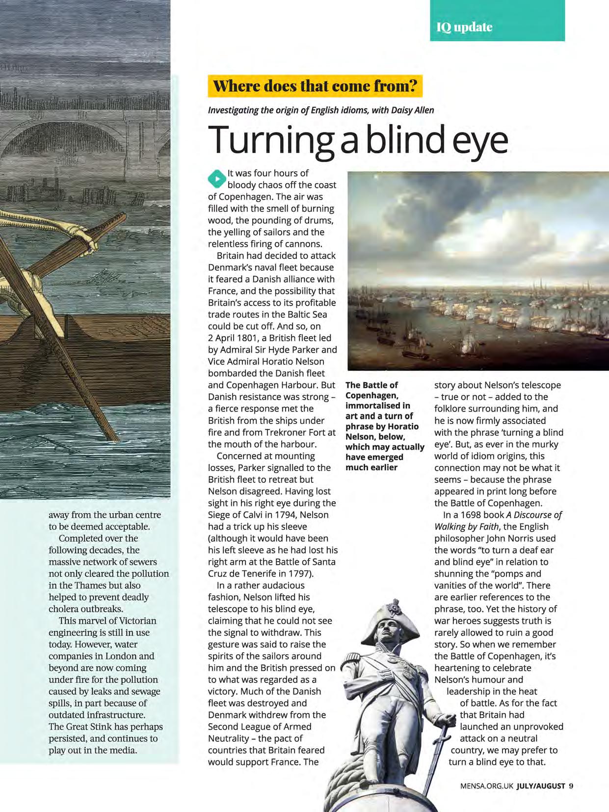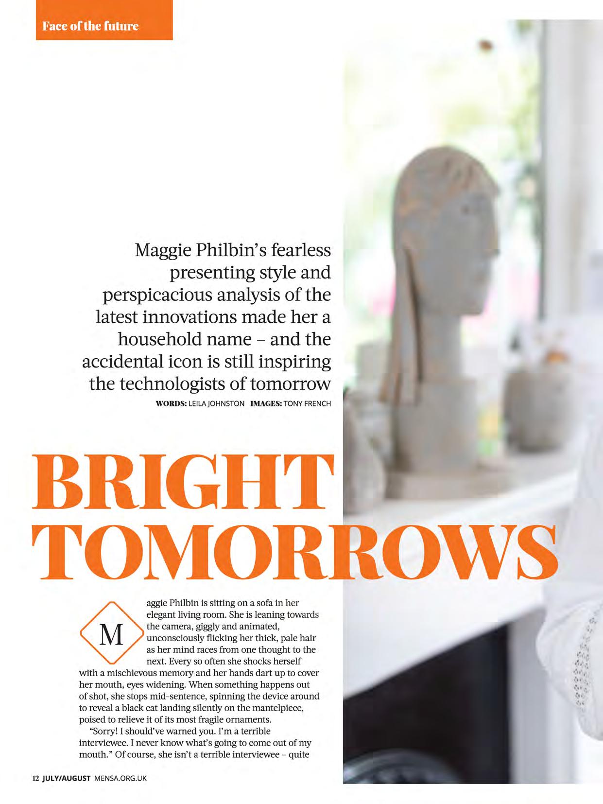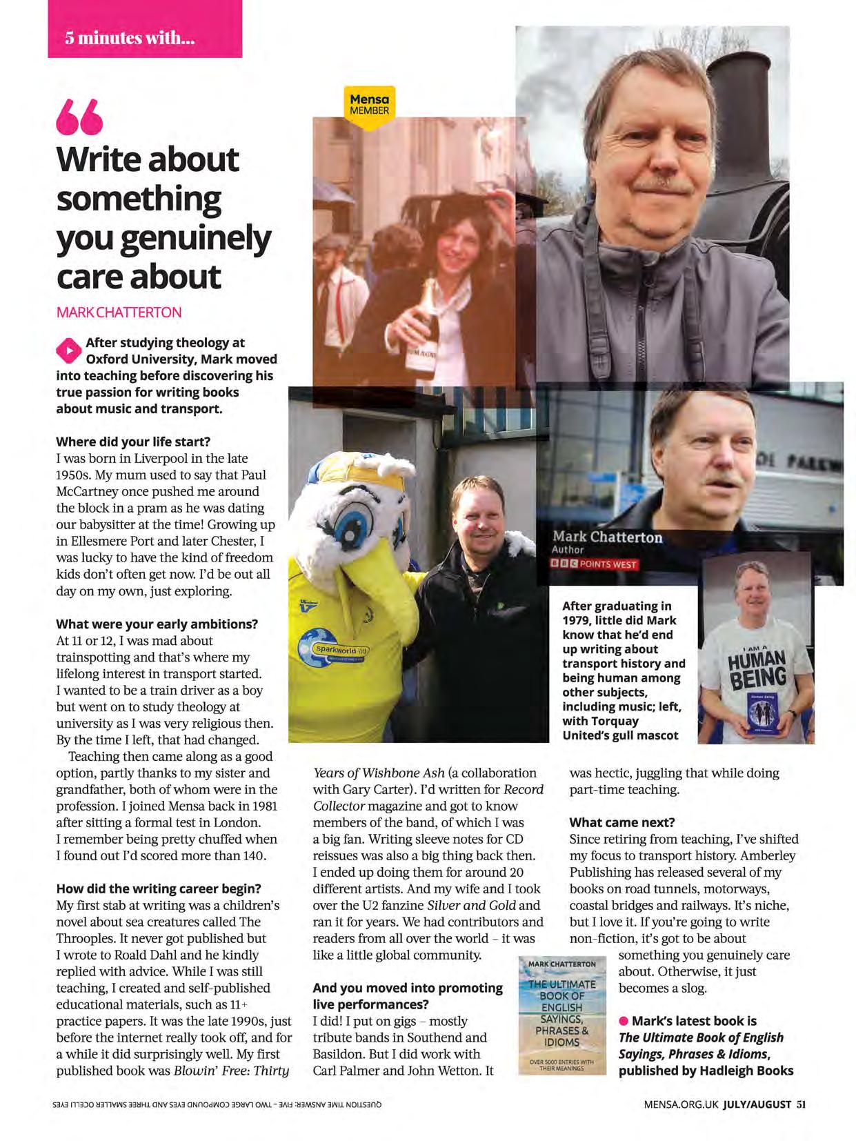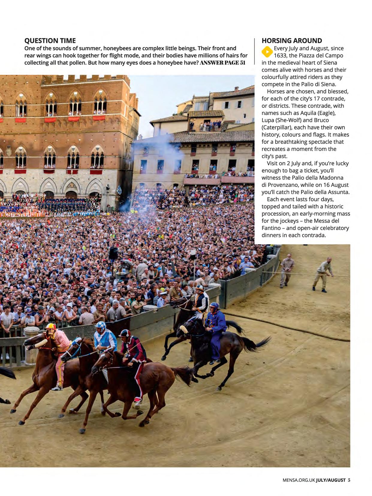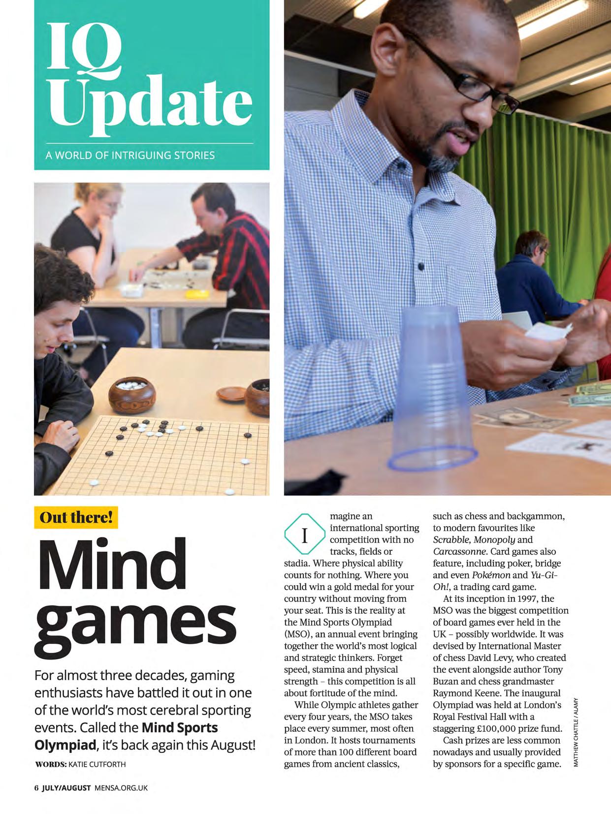 In 5 Minutes with ... (pSl), Mark Chatterton reflects on a writing career inspired by his love of music and transport. On pp42-43, lead organiser of this year's European Mensas Annual Gathering (EMAG),Ann Rootkin, shares her Mensa journey and excitement ahead of EMAGin Cardiff on 6 August. And, as ever, the Puzzle Panel provides some fiendish challenges in Mind Games (pp44-47).