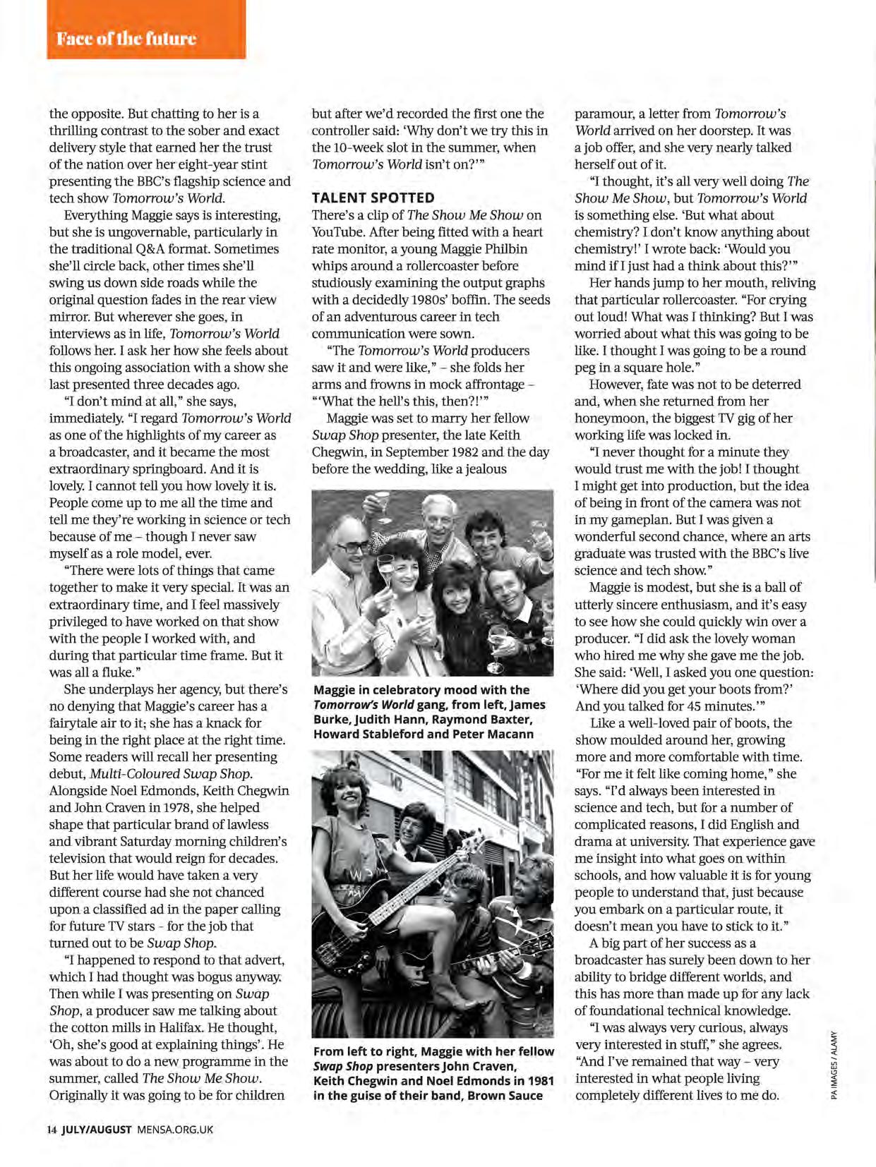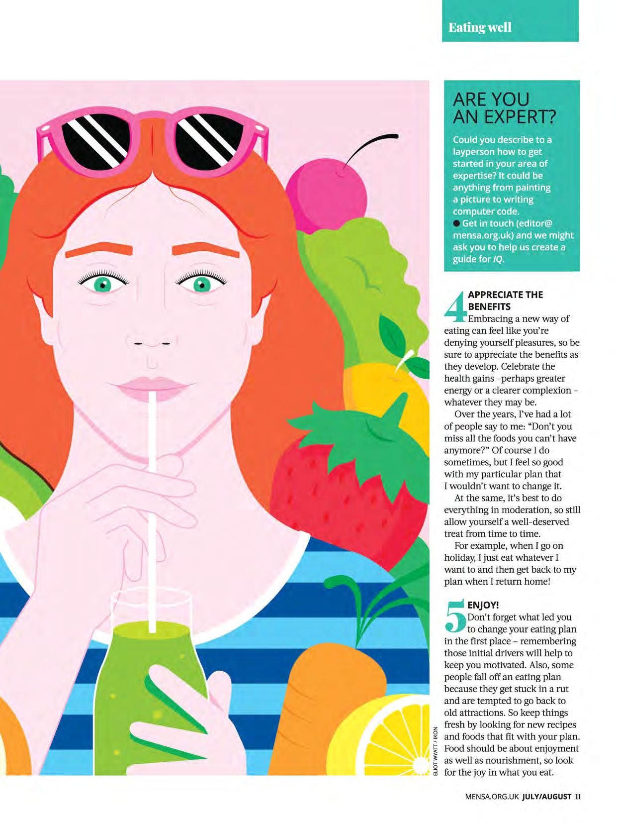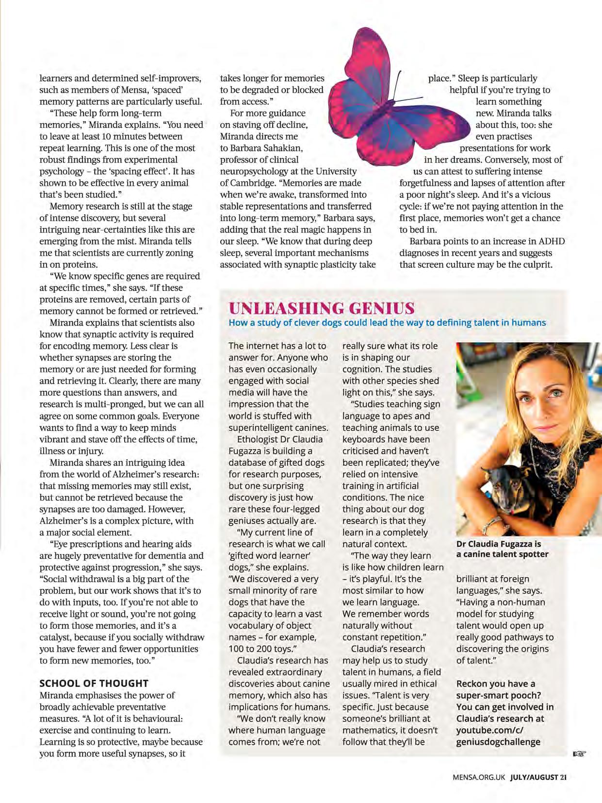As usual, the magazine includes a tremendous roll call of Mensans. On ppl0-11, fitness enthusiast Lyn Taylor offers advice to anyone considering a major change to their eating habits. While on p41, Chris Spriggs reflects on more than 30 years of running the Health & Fitness Special Interest Group.