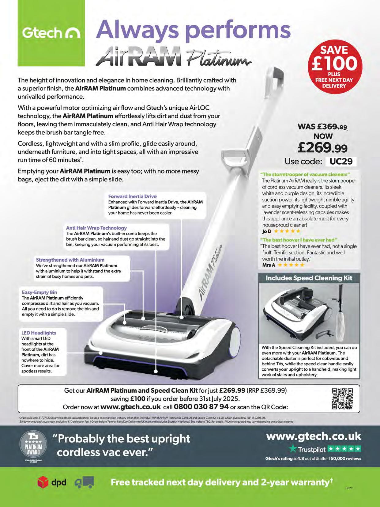 "The stormtrooper of vacuum cleaners" The PlatinumAirRAM really is the stormtrooper of cordless vacuum cleaners. Its sleek white and purple design, its incredible suction power, its lightweight nimble agility and easy emptying facility, coupled with lavender scent-releasing capsules makes this appliance an absolute must for every houseproud cleaner!