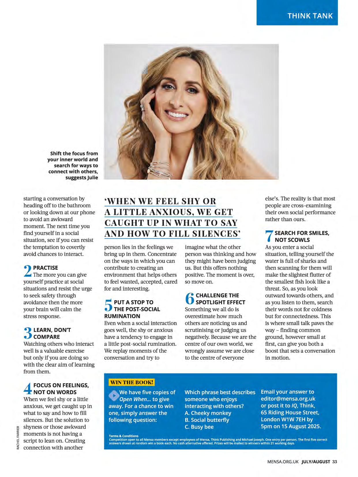 elcome to the July/August issue of IQ! It's a busy summer at British Mensa, starting with the election of four members to our Board of Directors. This is a valuable opportunity to help shape our future, so please take a moment to select the nominees you believe are best equipped to guide our strategic direction then cast your vote. The deadline is noon on Monday 21 July. To learn more about the nominees and how to vote, visit mensa. org.uk/ 2025-director-elections