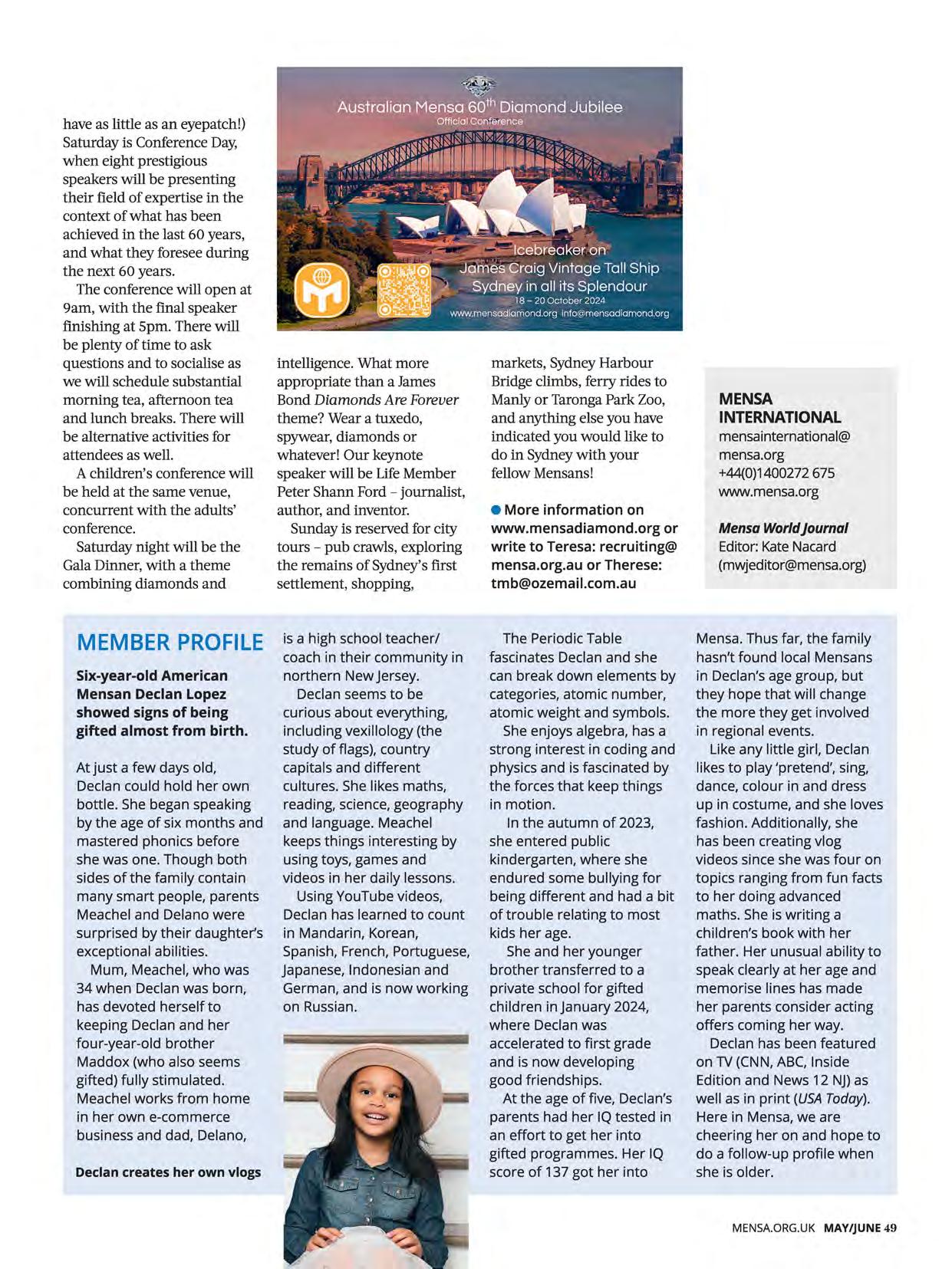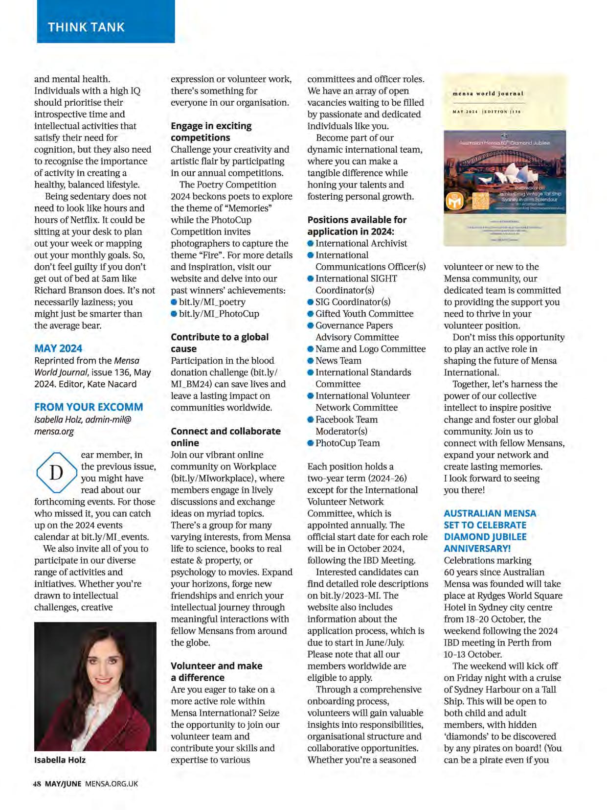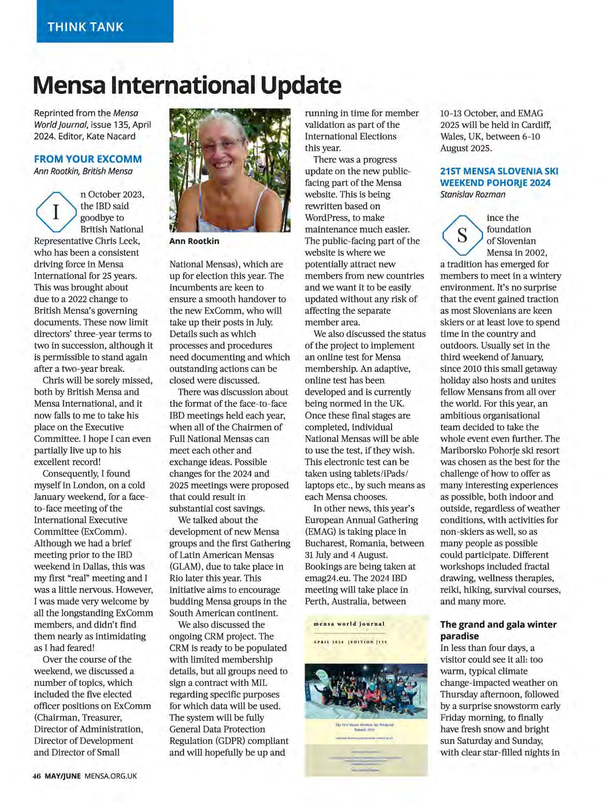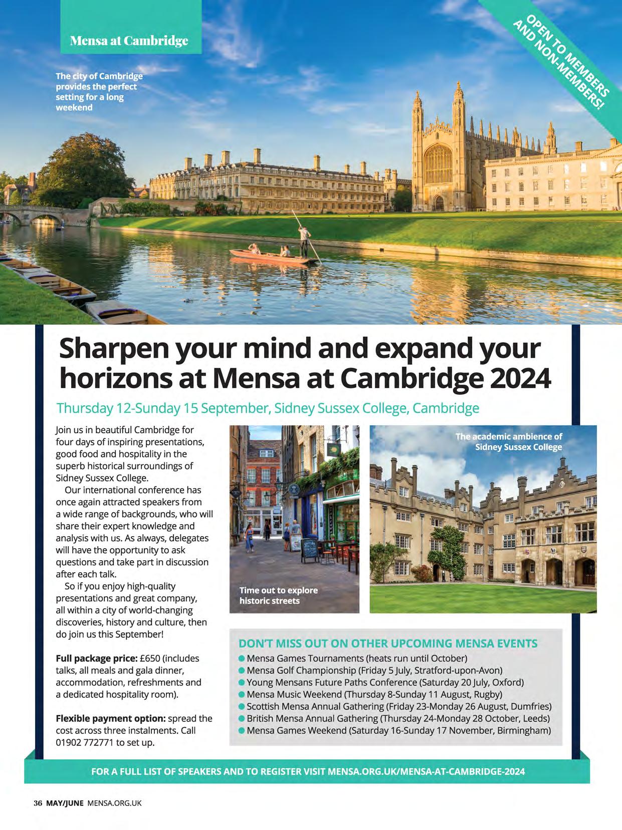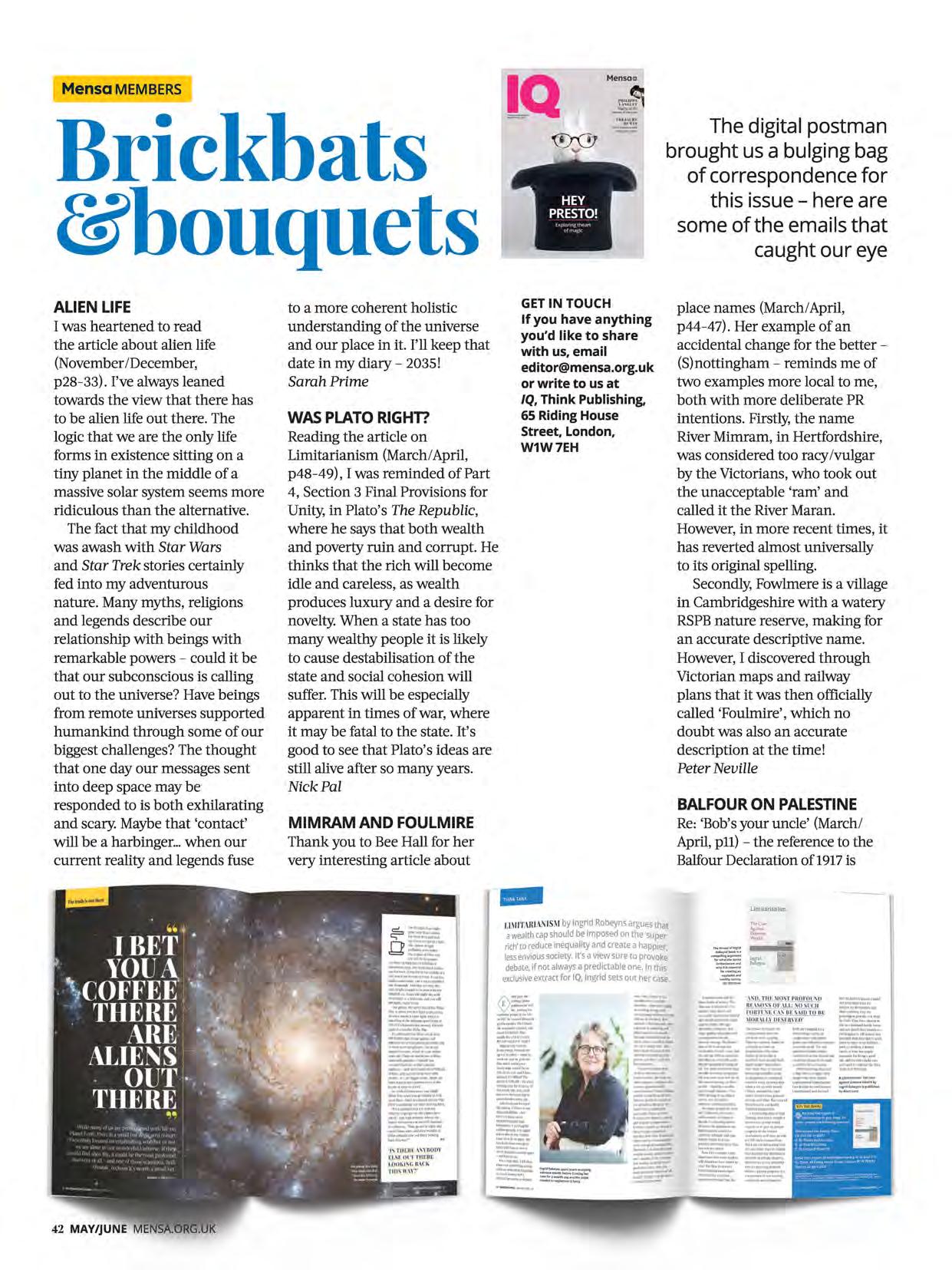 Elsewhere, as ever, Mensans make a rich contribution to the editorial mix. In his regular 'Where does that come from?' slot (p8), Stephen Colboum turns his attention to the origins of 'over the moon', the IQ Puzzle Panel delivers its usual fiendish teasers in Mind Games (pS0-55), and we have some great member contributions to Brickbats & Bouquets (p42-43) this time around.