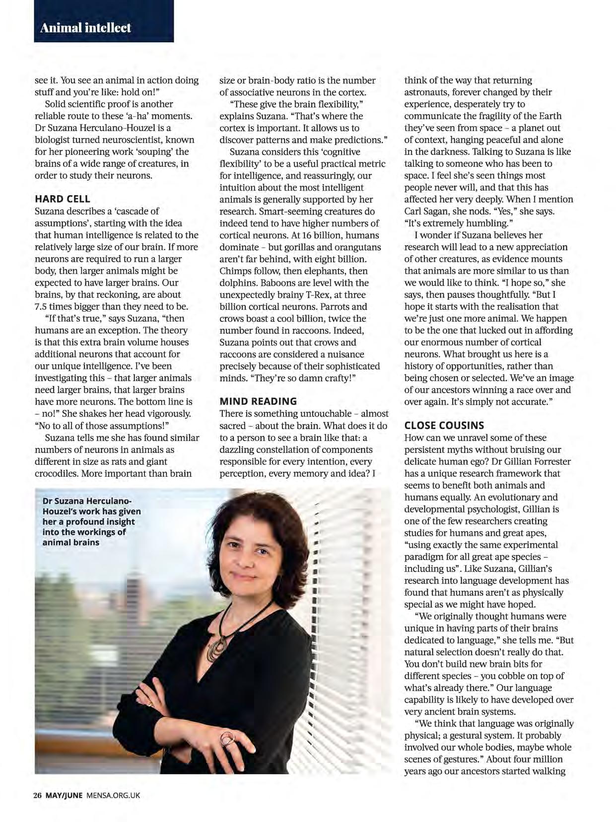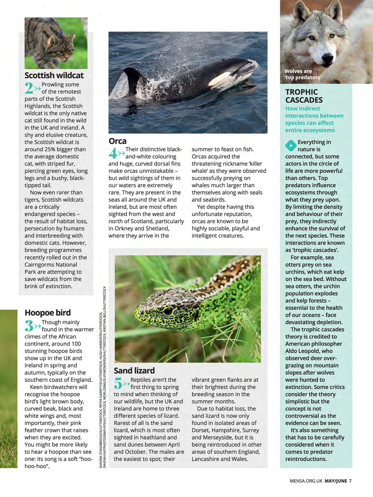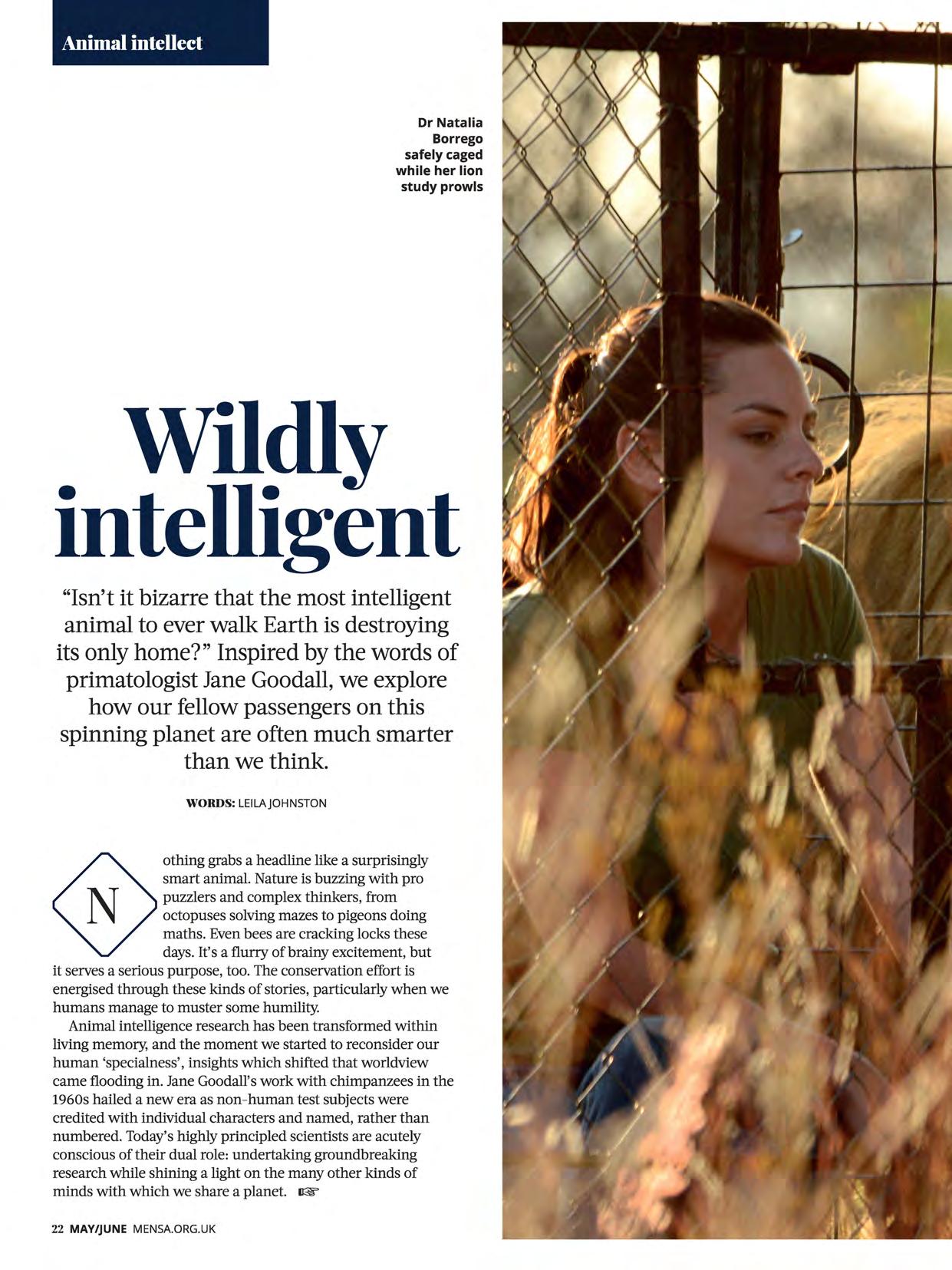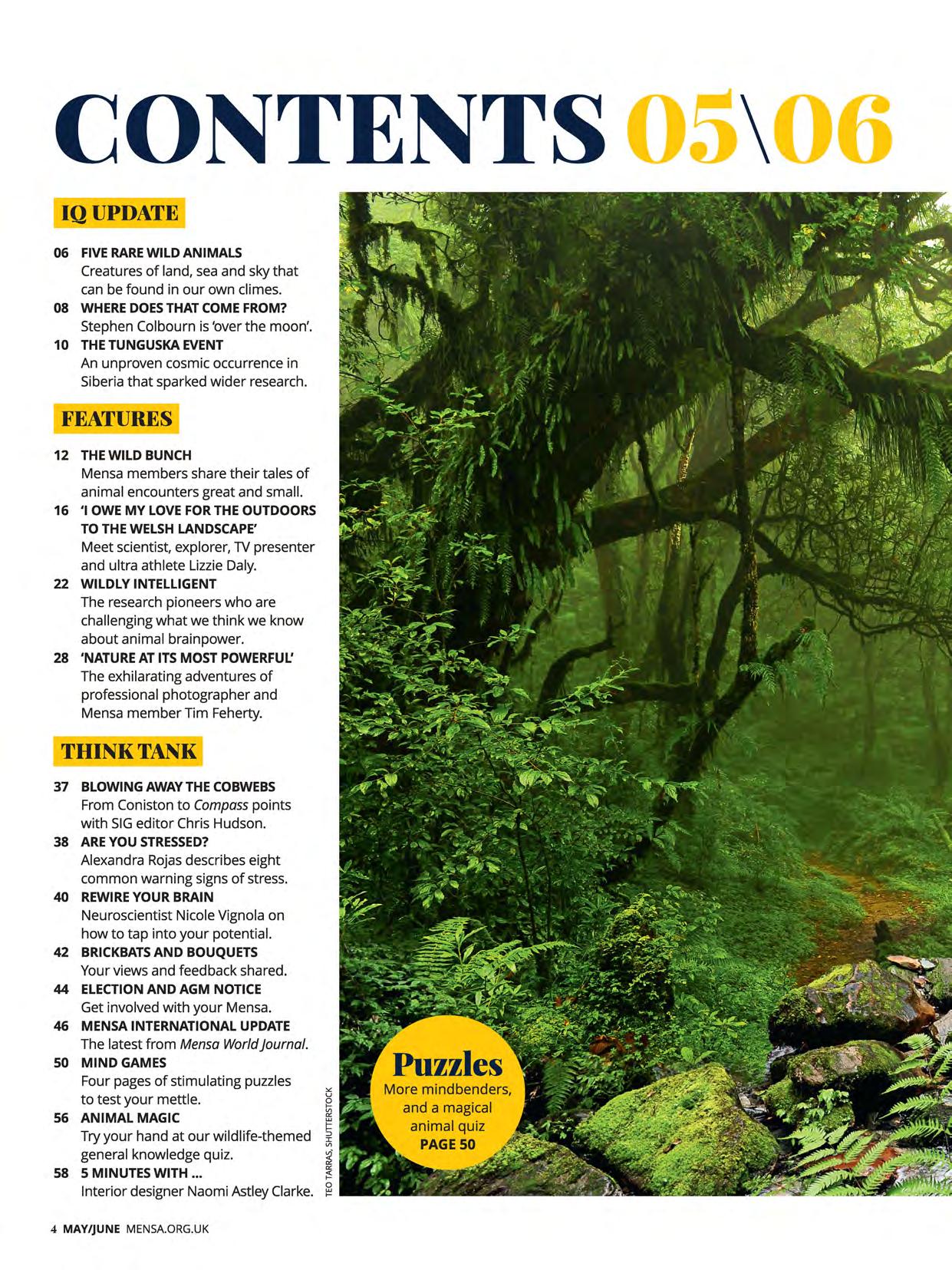 So a big thank you to Tim for supplying the beautiful image for this issue's cover, and the extraordinary wildlife shots accompanying our fascinating interview with him (p28-35). That led us to put the word out via My Mensa Weekly for any other Mensa members with interesting wildlife-related tales to share and you didn't disappoint (p12-15).The theme then continues through our interview with TV presenter, explorer and scientist Lizzie Daly (p16-21), a deep dive into the world of animal intelligence (p22-27) and our wildlife quiz (p56-57).