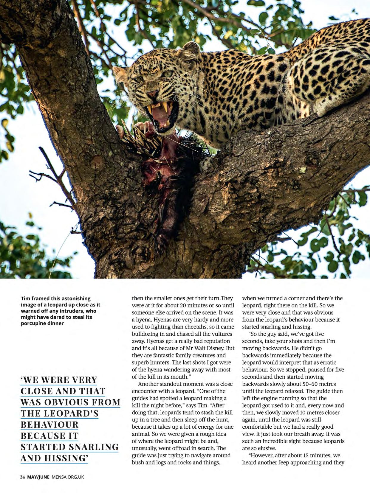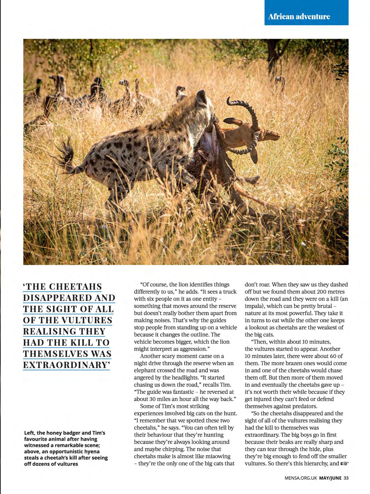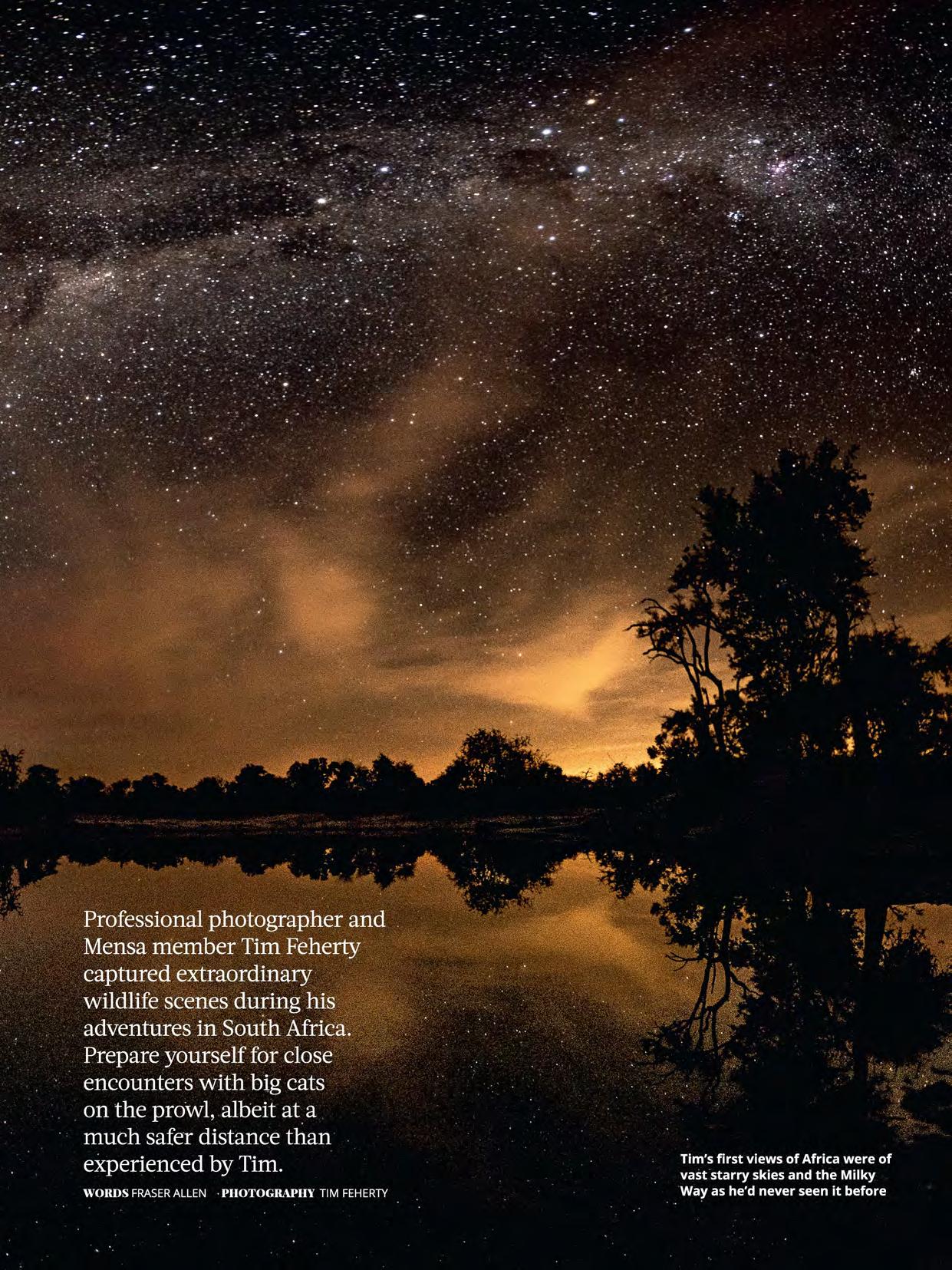 ith this issue we're very much taking a walk on the wild side. The idea began with an email from Mensa member Tim Feherty explaining his work with the volunteering organisation African Impact. Tim is a professional photographer, who has trained volunteers in South Africa in the art of wildlife photography, and when we saw some of the pictures he had taken himself, we were stunned.