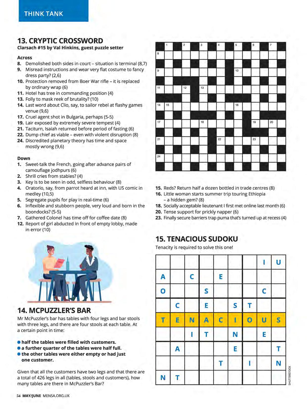 37 BLOWING AWAY THE COBWEBS From Coniston to Compasspoints with SIG editor Chris Hudson. 38 ARE YOU STRESSED? Alexandra Rojas describes eight common warning signs of stress. 40 REWIRE YOUR BRAIN Neuroscientist Nicole Vignola on how to tap into your potential. 42 BRICKBATSAND BOUQUETS Your views and feedback shared. 44 ELECTION AND AGM NOTICE Get involved with your Mensa. 46 MENSA INTERNATIONAL UPDATE The latest from Mensa WorldJournal. 50 MIND GAMES Four pages of stimulating puzzles to test your mettle. 56 ANIMAL MAGIC Try your hand at our wildlife-themed general knowledge quiz. 58 5 MINUTES WITH ... Interior designer Naomi Astley Clarke. 4 MAY/JUNE MENSA.ORG.UK More mindbenders, and a magical animal quiz PAGE 50