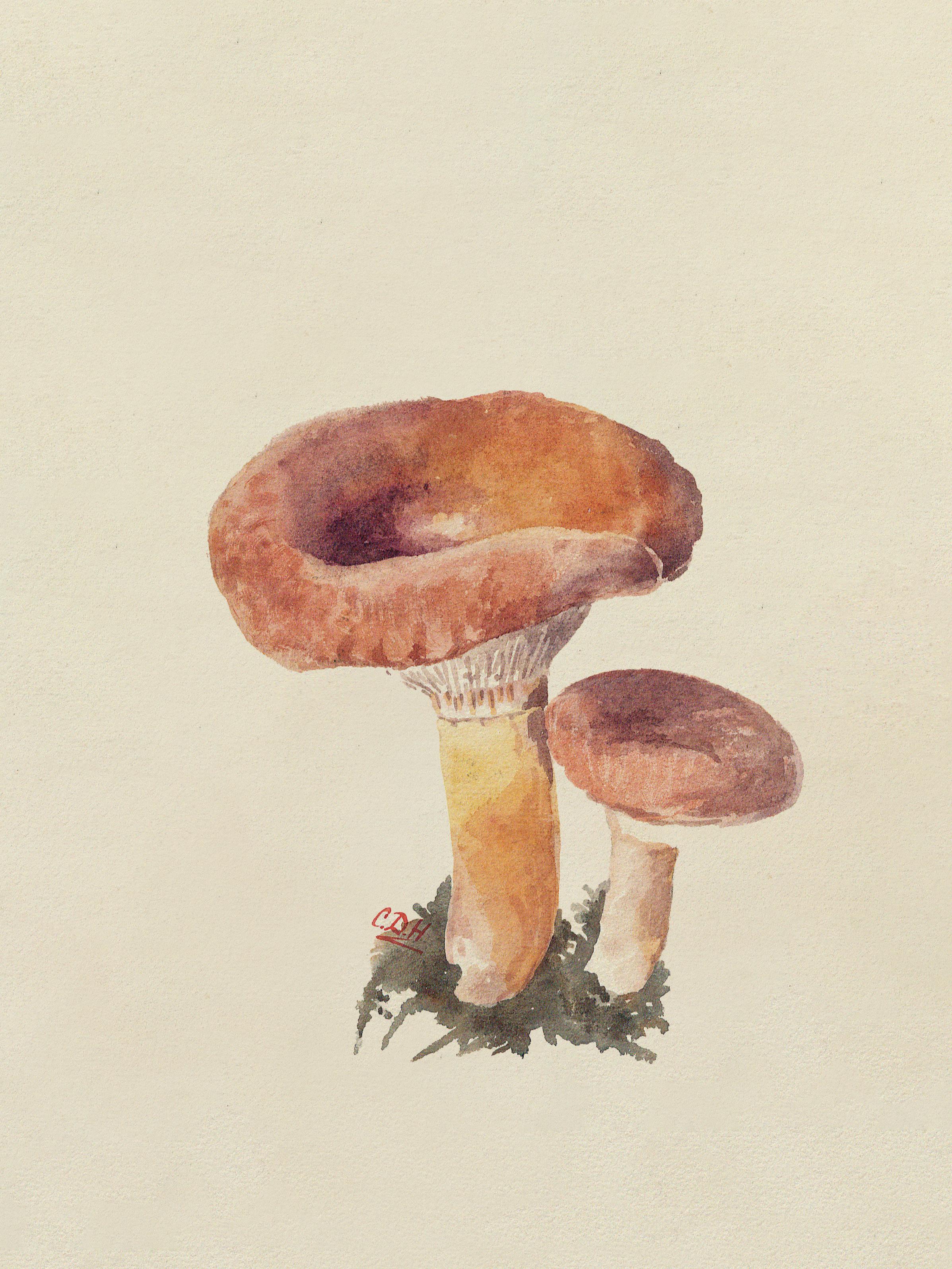 2Although not clear in this watercolour, painted by Constance Drummond-Hay in 1899, the woolly milkcap has a distinctive fluffy appearance. The artist’s description notes that “[t]his Lactarius is very downy & shaggy” and “of a beautiful strawberry colour … also ochre Turning Pale.”