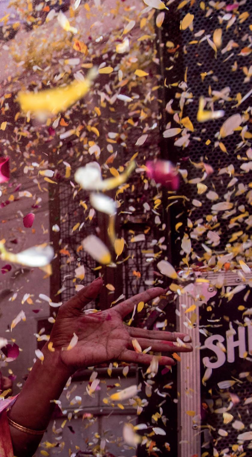 An elderly widow celebrates the Hindu festival of Holi by showering petals at the Gopinath Ji Temple in Vrindavan, India.