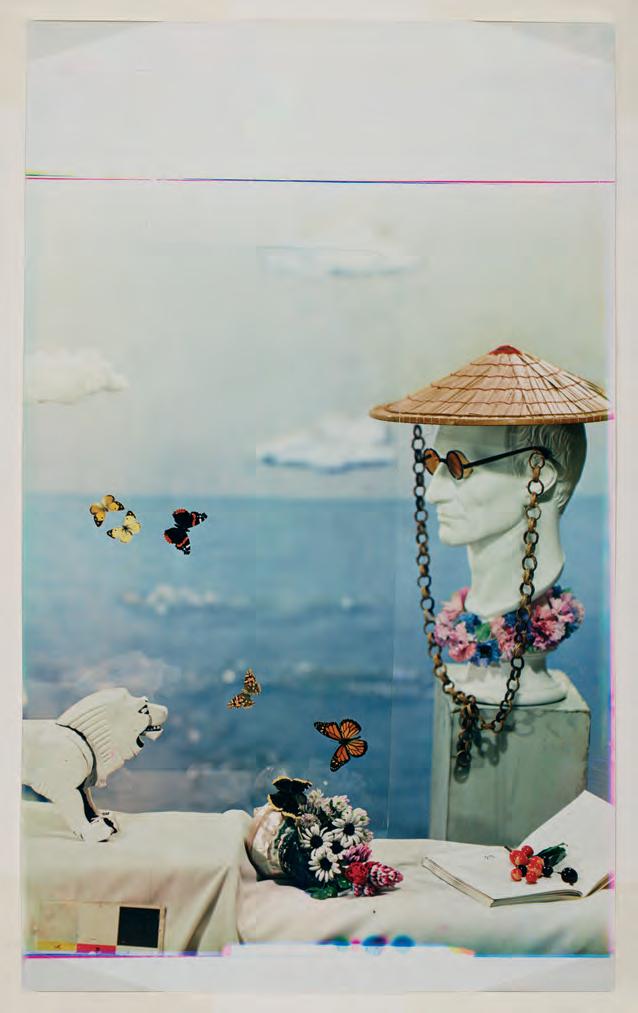 This eccentric photograph, ‘Still life July 1938’, shows a Roman bust with a floral wreath, bamboo hat, chain and sunglasses on a pedestal, a book with cherries on its pages, a tipped over vase of flowers, a white lion sculpture and five suspended butterflies. All are set before a painted cloud and seascape backdrop. A partial colour checker is visible in the lower left.