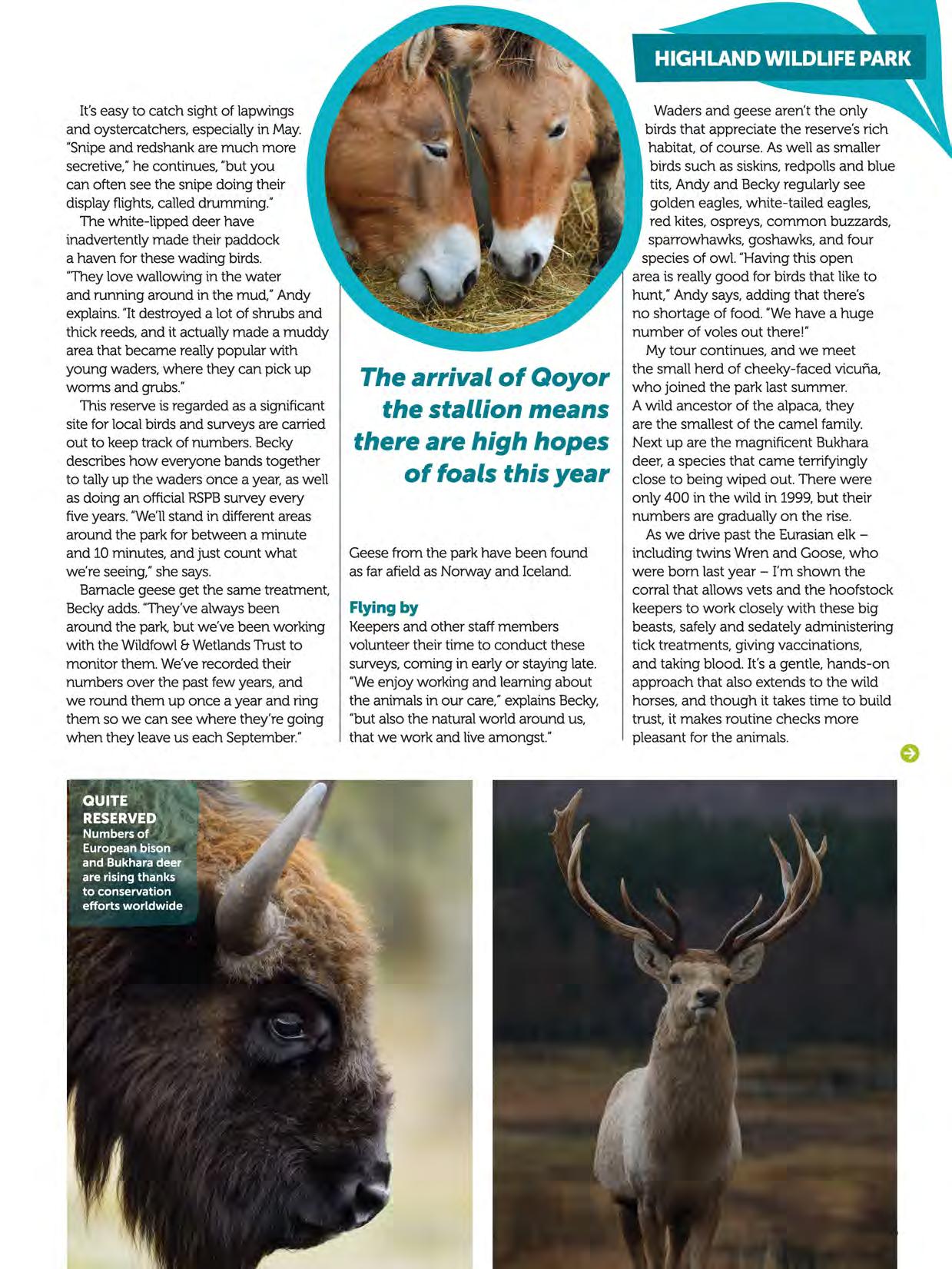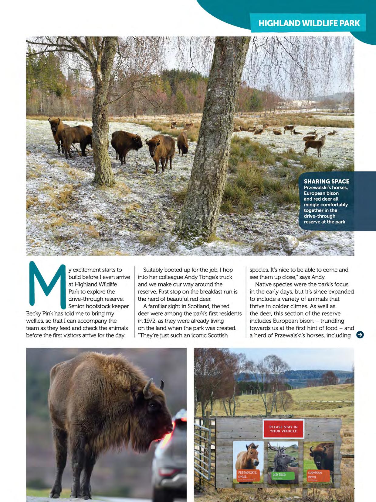 Writer Laura Brown took a tour of the drive-through reserveat Highland Wildlife Park in the company of keepersand conservationists to discover more about the animals who live there. Photographer Laurie Campbell visited Highland Wildlife Parkto photograph the animals for this magazine -and for our new Highland Wildlife Park guidebook, coming soon!