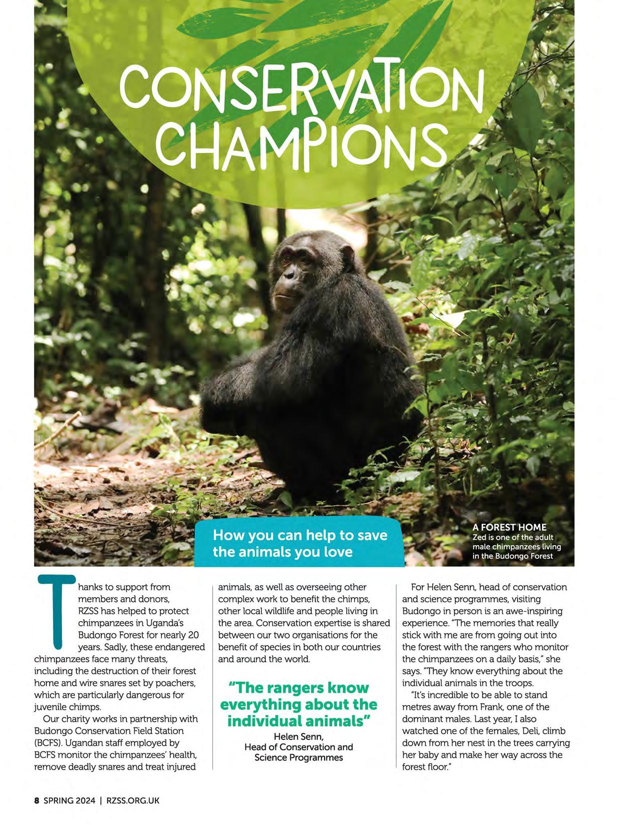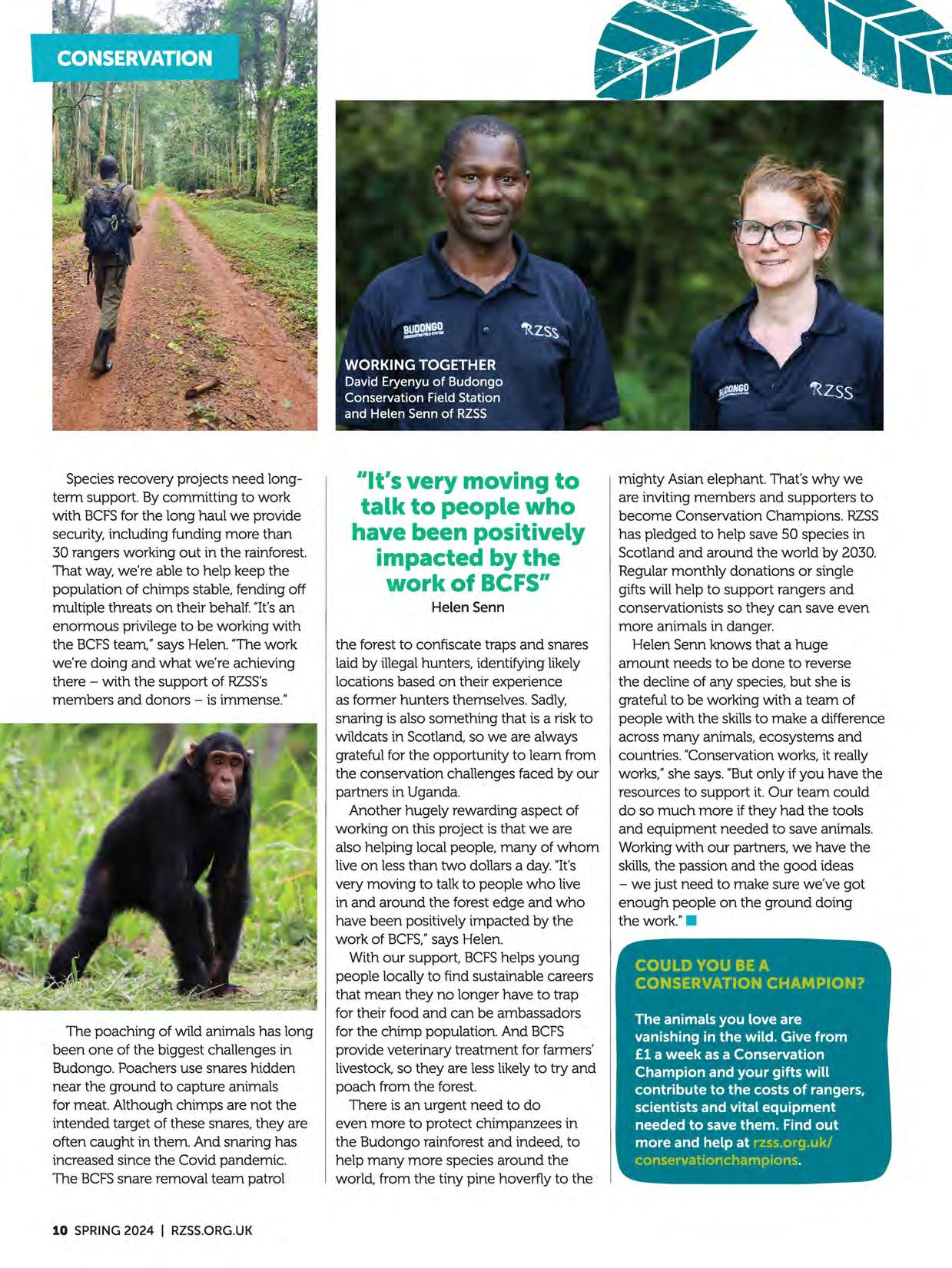 Species recovery projects need longterm support. By committing to work with BCFSfor the long haul we provide security, including funding more than 30 rangers working out in the rainforest. That way, we're able to help keep the population of chimps stable, fending off multiple threats on their behalf. "It'san enormous privilege to be working with the BCFSteam," says Helen. 'The work we're doing and what we're achieving there -with the support of RZSS's members and donors -is immense."