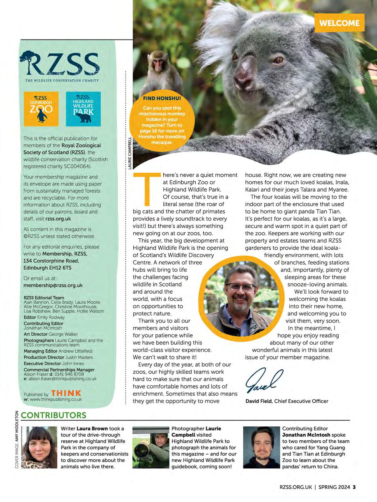 house. Right now, we are creating new homes for our much loved koalas, lnala, Kalari and their joeys Talara and Myaree. The four koalas will be moving to the indoor part of the enclosure that used to be home to giant panda Tian Tian. It's perfect for our koalas, as it's a large, secure and warm spot in a quiet part of the zoo. Keepers are working with our property and estates teams and RZSS gardeners to provide the ideal koalafriendly environment, with lots of branches, feeding stations and, importantly, plenty of sleeping areas for these snooze-loving animals. We'll look forward to welcoming the koalas into their new home, and welcoming you to visit them, very soon. In the meantime, I hope you enjoy reading about many of our other wonderful animals in this latest issue of your member magazine.