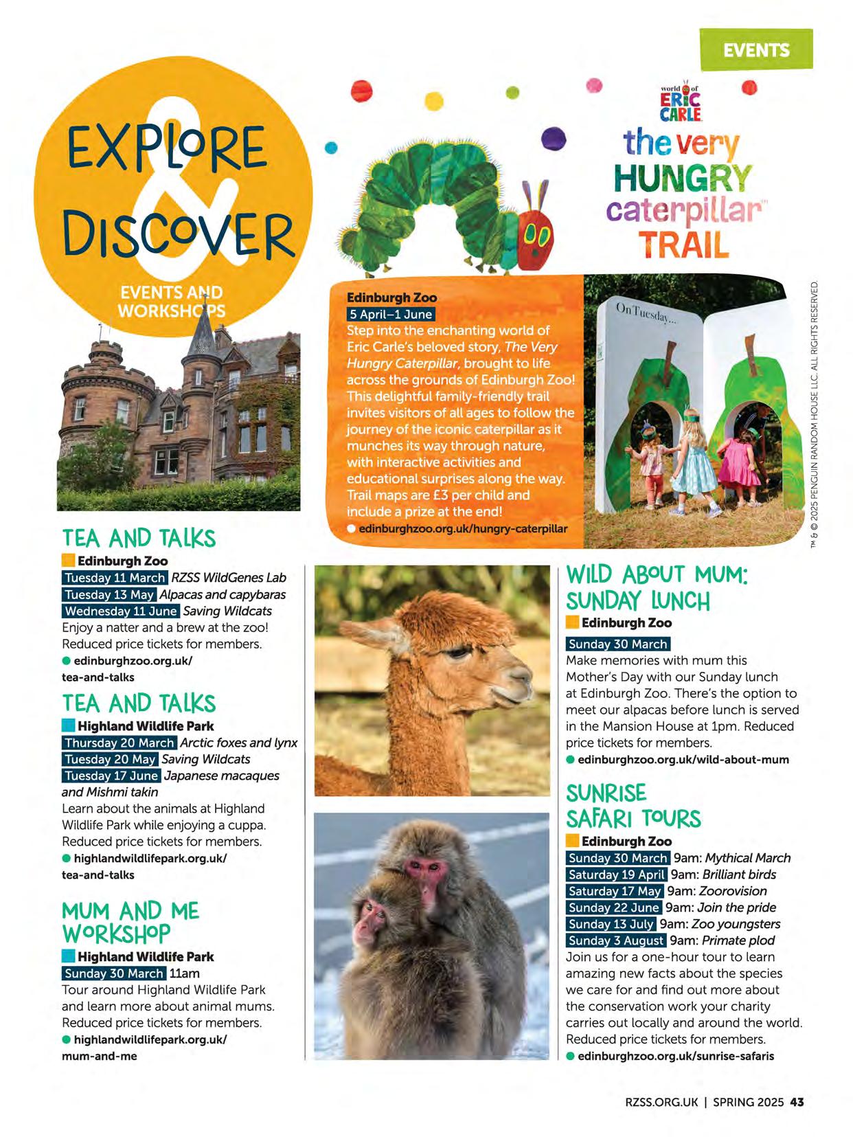 The zoo's discovery and learning team lead this active and engaging threehour session. Spring Explorers aims to deepen nature connections for younger audiences through animal-themed learning and wild natural spaces at the zoo. Suitable for P3-7 aged children. Member discounts are available. edinburghzoo.org.uk/spring-explorers