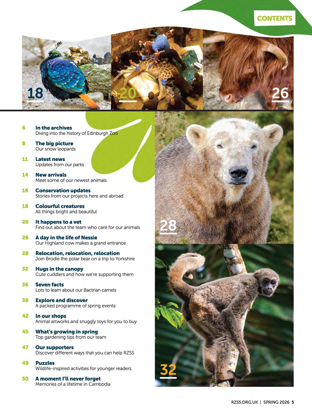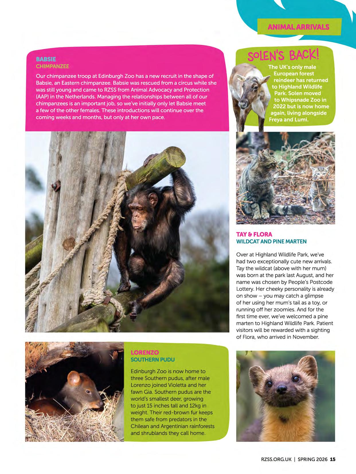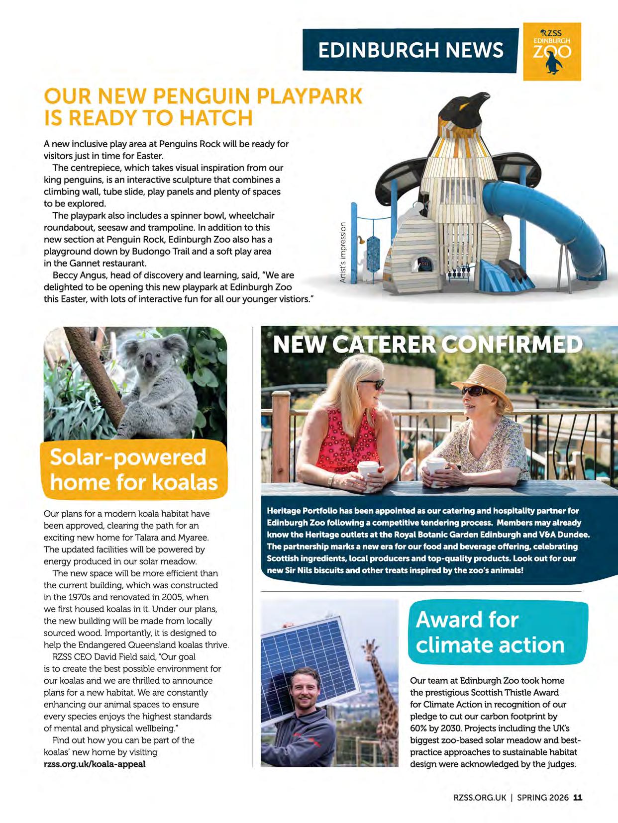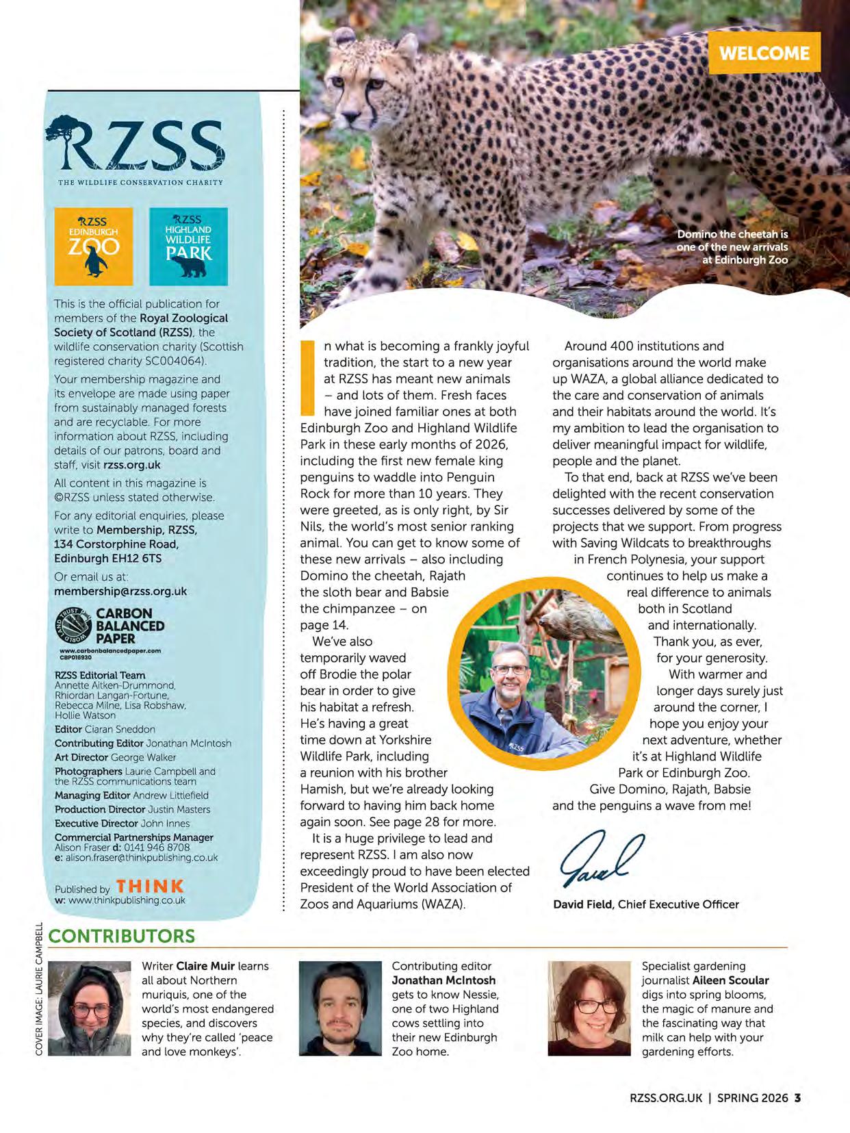 In what is becoming a frankly joyful tradition, the start to a new year at RZSShas meant new animals -and lots of them. Fresh faces have joined familiar ones at both Edinburgh Zoo and Highland Wildlife Park in these early months of 2026, including the first new female king penguins to waddle into Penguin Rock for more than 10 years. They were greeted, as is only right, by Sir Nils, the world's most senior ranking animal. You can get to know some of these new arrivals -also including Domino the cheetah, Rajath the sloth bear and Babsie the chimpanzee -on page 14.