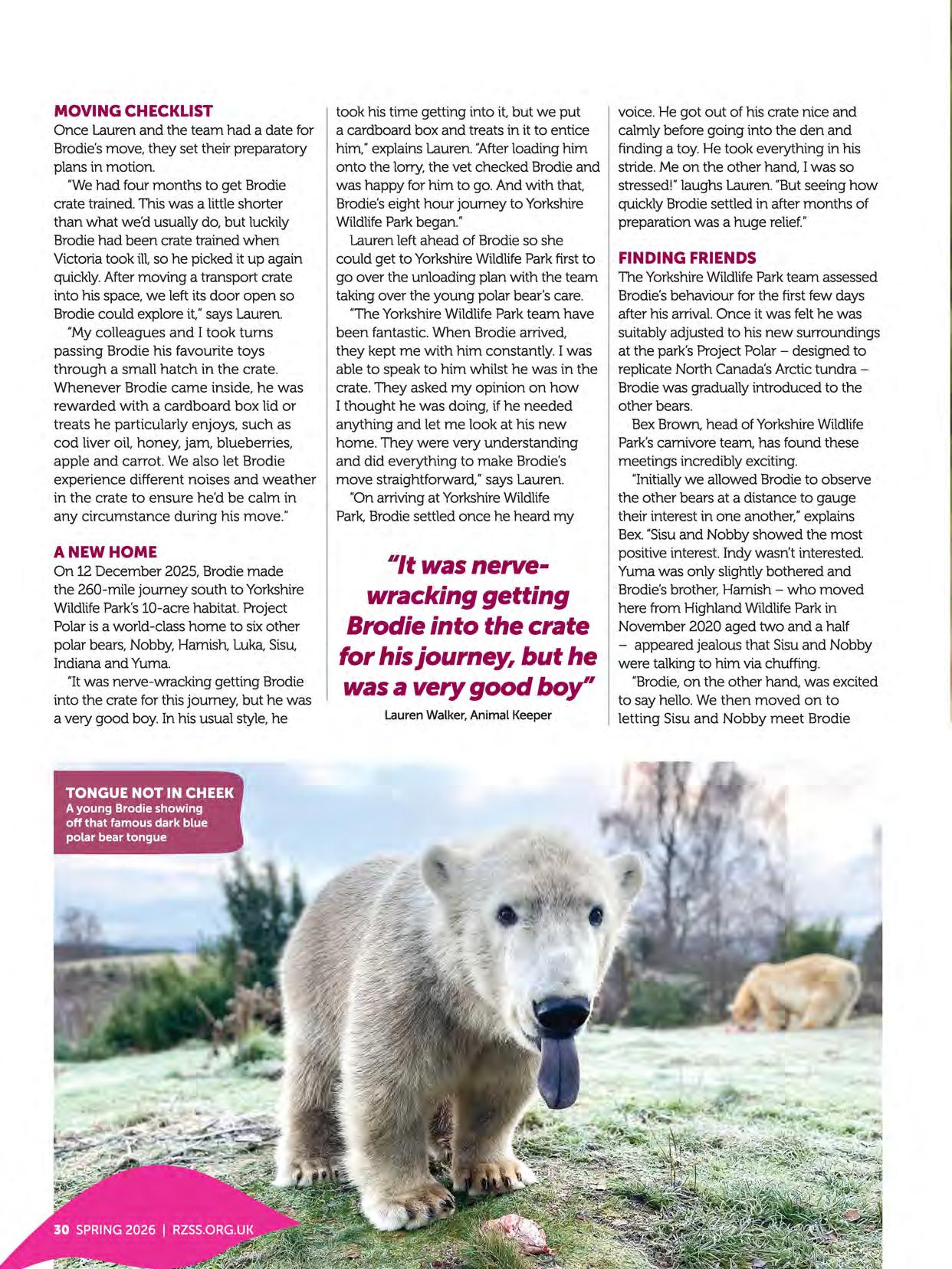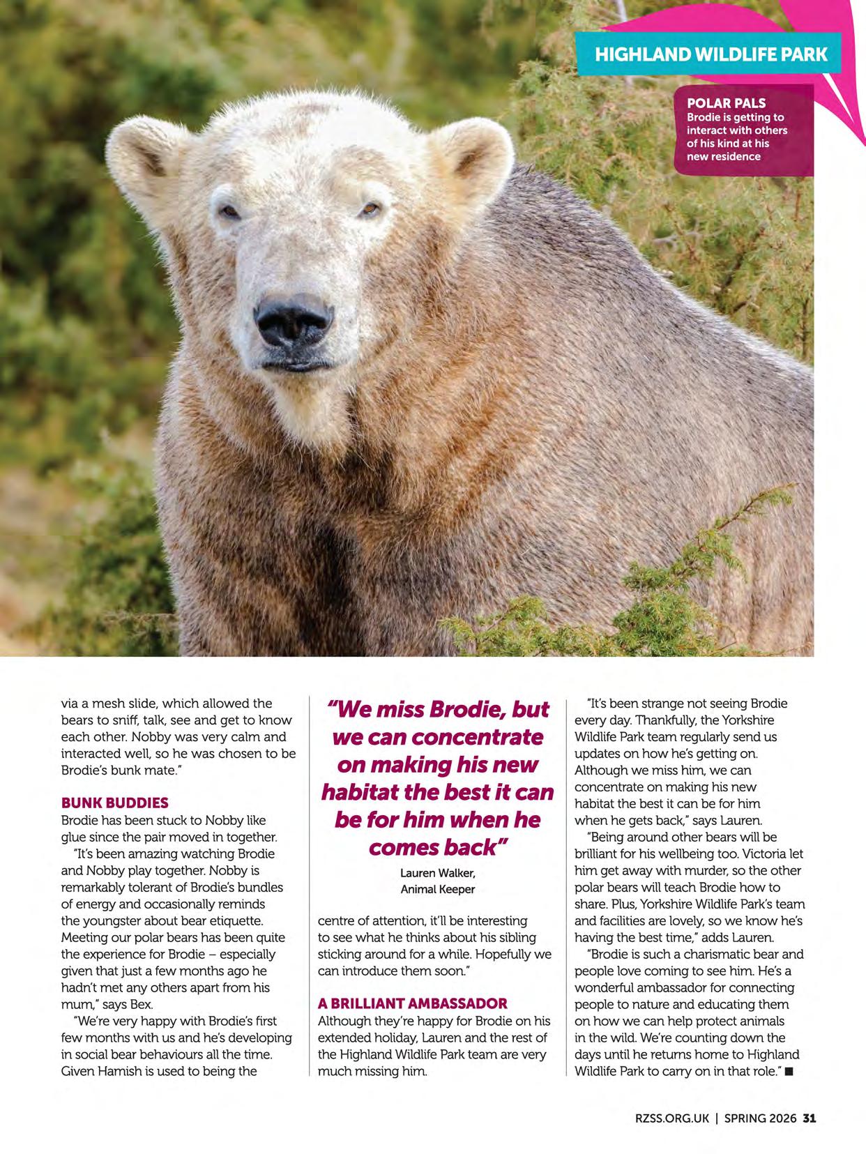 We've also temporarily waved off Brodie the polar bear in order to give his habitat a refresh. He's having a great time down at Yorkshire Wildlife Park, including a reunion with his brother Hamish, but we're already looking forward to having him back home again soon. See page 28 for more.