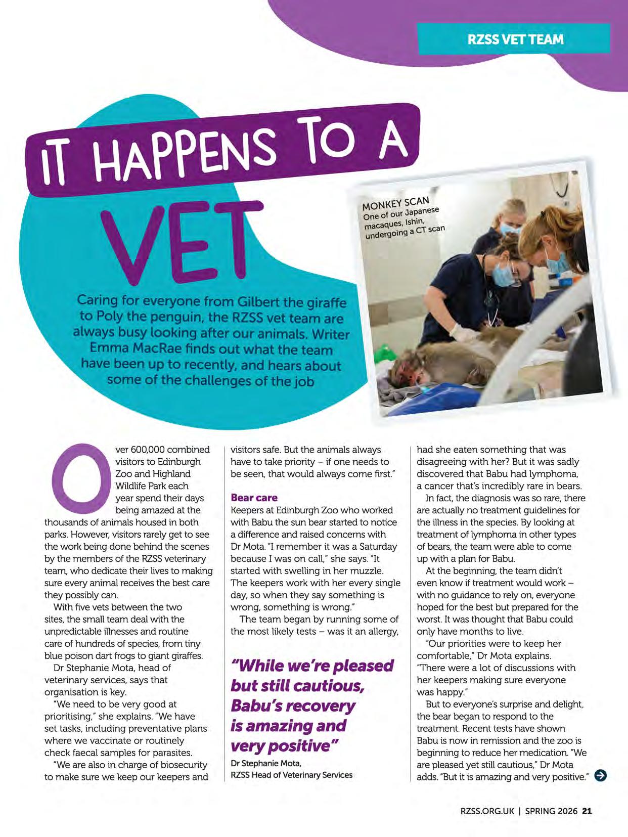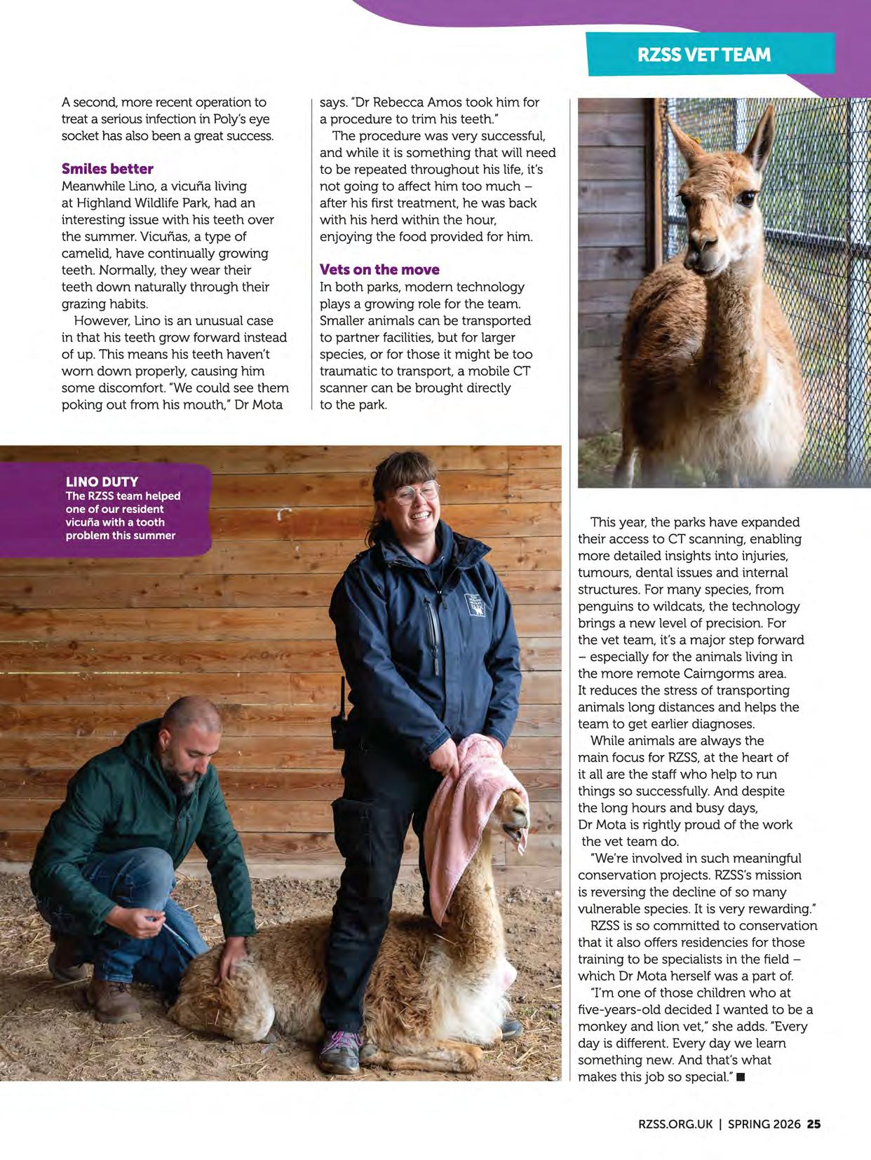 ver 600,000 combined visitors to Edinburgh Zoo and Highland WildlifePark each year spend their days being amazed at the thousands of animals housed in both parks. However, visitors rarely get to see the work being done behind the scenes by the members of the RZSSveterinary team, who dedicate their lives to making sure every animal receives the best care they possibly can.