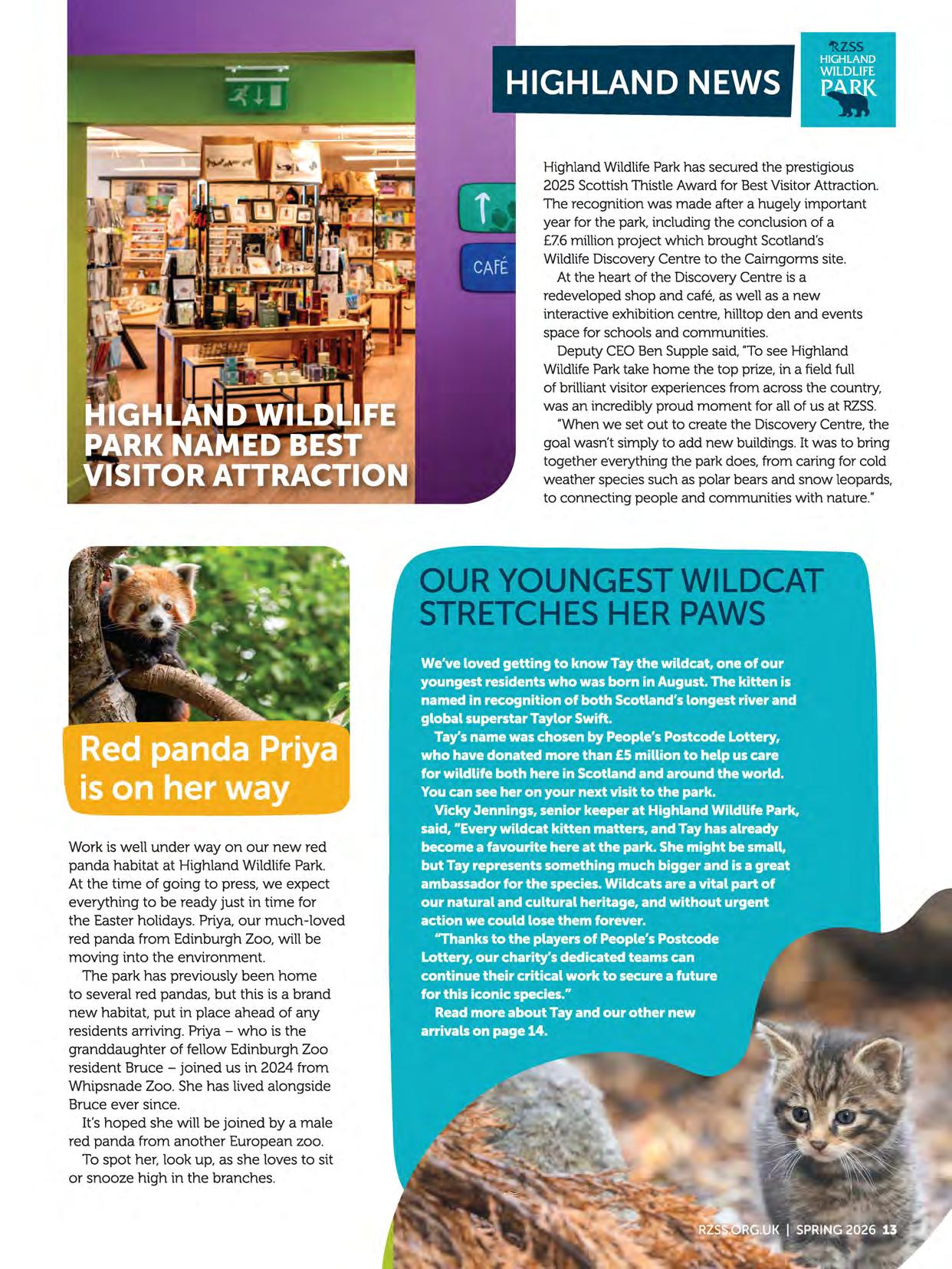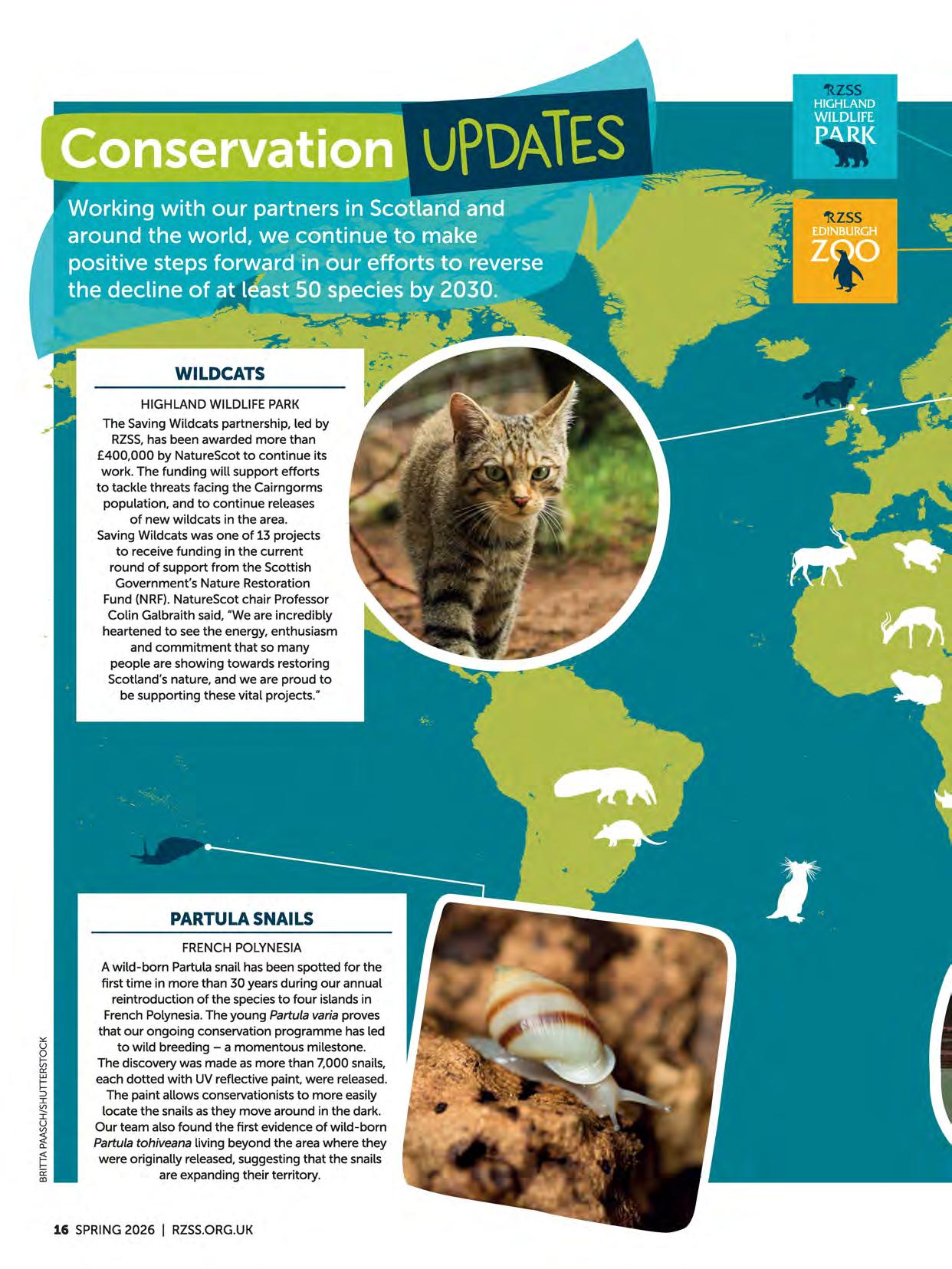 To that end, back at RZSSwe've been delighted with the recent conservation successes delivered by some of the projects that we support. From progress with Saving Wildcats to breakthroughs in French Polynesia, your support continues to help us make a real difference to animals both in Scotland and internationally. Thank you, as ever, for your generosity. With warmer and longer days surely just around the corner, 1 hope you enjoy your next adventure, whether it's at Highland Wildlife Park or Edinburgh Zoo. Give Domino, Rajath, Babsie and the penguins a wave from me!