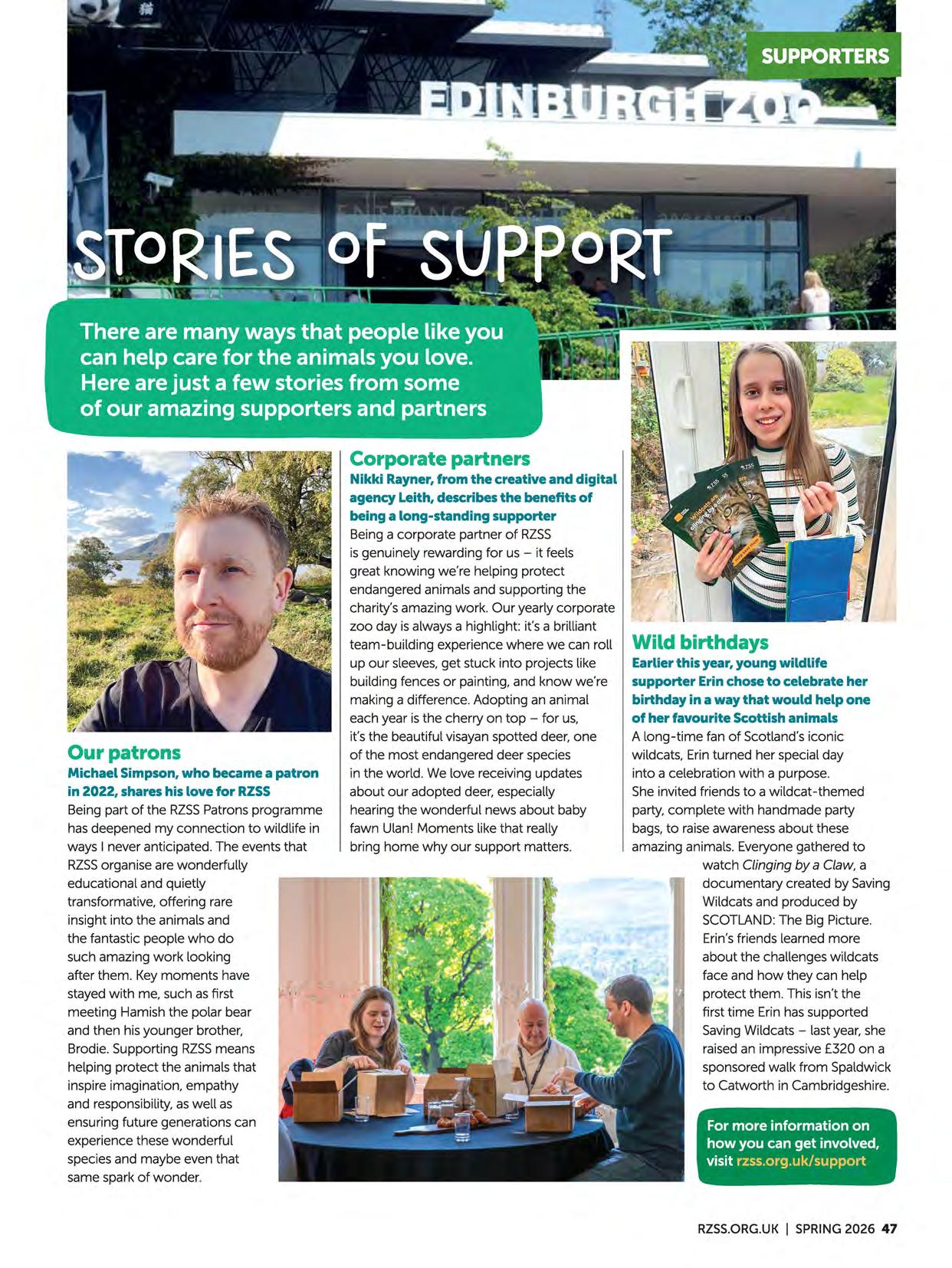 Nikki Rayner, from the creative and digital agency Leith, describes the benefits of being a long-standing supporter Being a corporate partner of RZSS is genuinely rewarding for us -it feels great knowing we're helping protect endangered animals and supporting the charity's amazing work. Our yearly corporate zoo day is always a highlight: it's a brilliant team-building experience where we can roll up our sleeves, get stuck into projects like building fences or painting, and know we're making a difference. Adopting an animal each year is the cherry on top -for us, it's the beautiful visayan spotted deer, one of the most endangered deer species in the world. We love receiving updates about our adopted deer, especially hearing the wonderful news about baby fawn Ulan! Moments like that really bring home why our support matters.