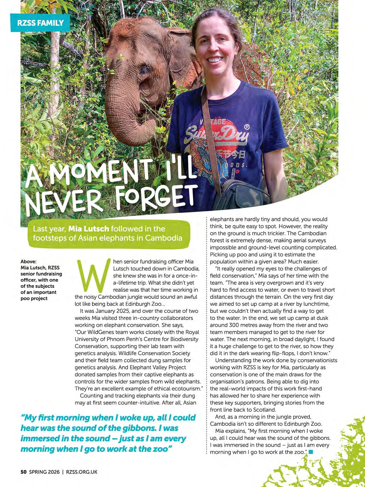 When senior fundraising officer Mia Lutsch touched down in Cambodia, she knew she was in for a once-ina-lifetime trip. What she didn't yet realise was that her time working in the noisy Cambodian jungle would sound an awful lot like being back at Edinburgh Zoo ...