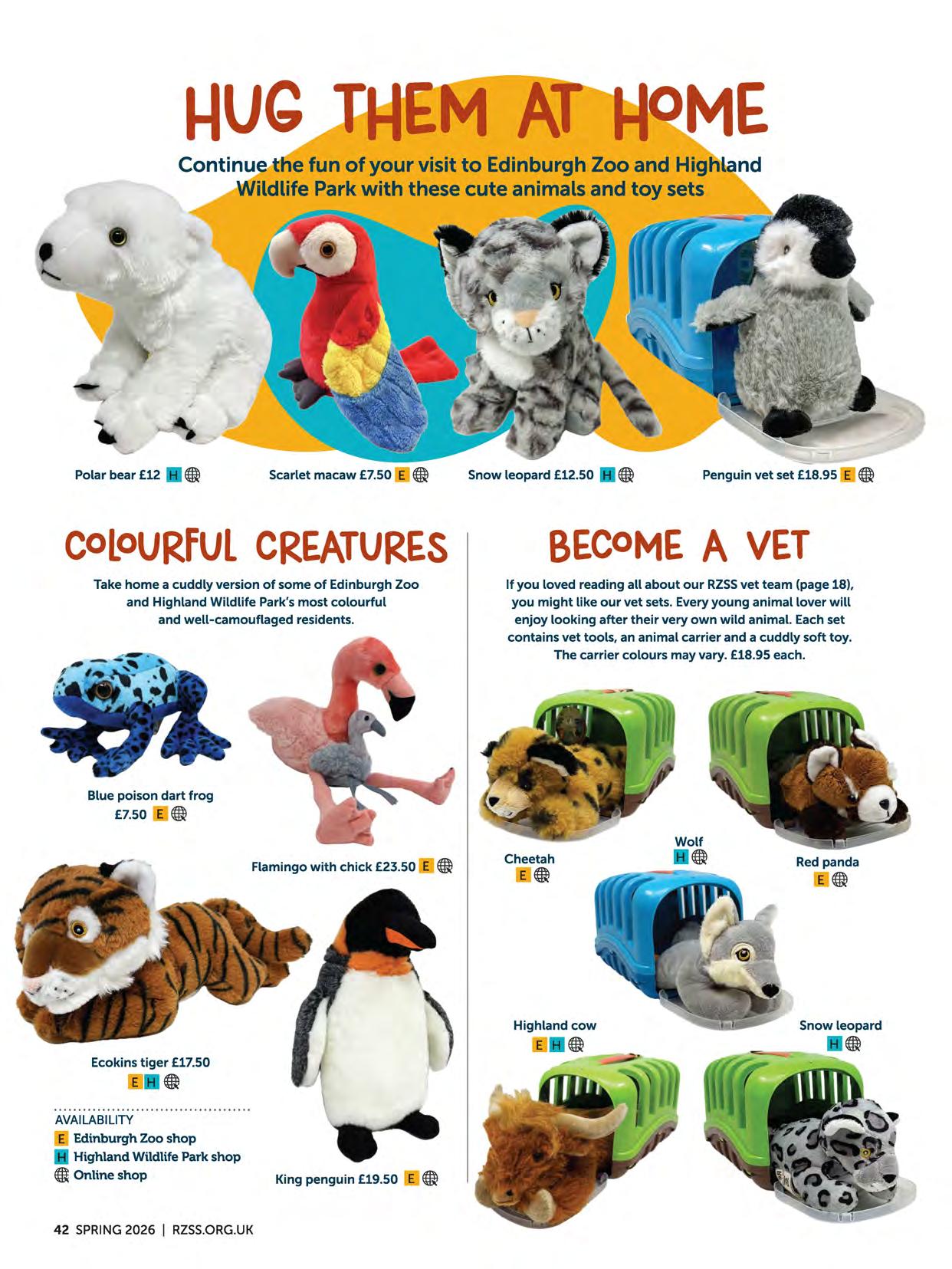 Take home a cuddly version of some of Edinburgh Zoo and Highland Wildlife Park's most colourful and well-camouflaged residents.