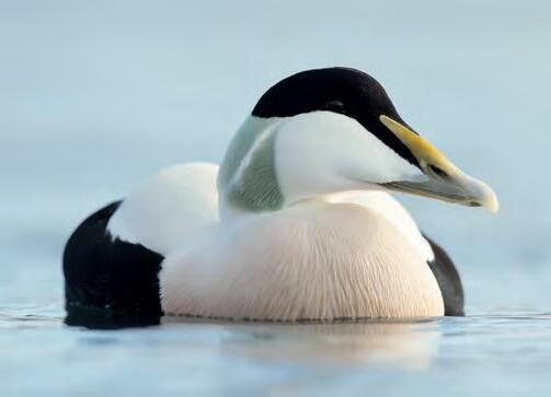 The male eider develops a spearmintgreen nape and upper beak and a jet-black brow that looks like velvet. His breast turns a delicate pink, and his whole head and neck appear to swell, so he looks as large and imposing as possible.