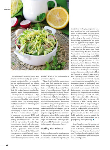 ALBERT. Maths on this level uses a lot of computational power. Taking the cell modelling idea to its extreme, some food scientists are trying to model every plant cell to make a complete fruit — a virtual fruit. They model, ‘the exchange of gases and so on since fruit is still respiring, still alive after harvesting.’ To control the respiration process, they ‘try to control the amount of [the hormone] ethylene, oxygen gas, and so on.’ They also use these models to simulate modified atmospheres around food seeing how they influence respiration rates. Shelf life is affected by plastic packages with different holes sizes, types of plastic, and other parameters. All of these properties are pumped into the mathematical equations and tweaked to maximise shelf life. ‘If you slow rates down, the food lasts longer and can be stored for a longer period,’ explained Dr Valdramidis, which makes both companies and consumers happy.