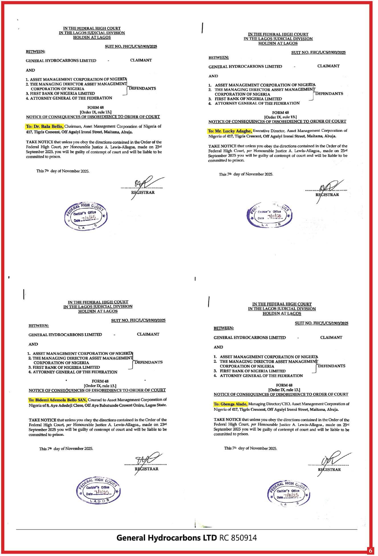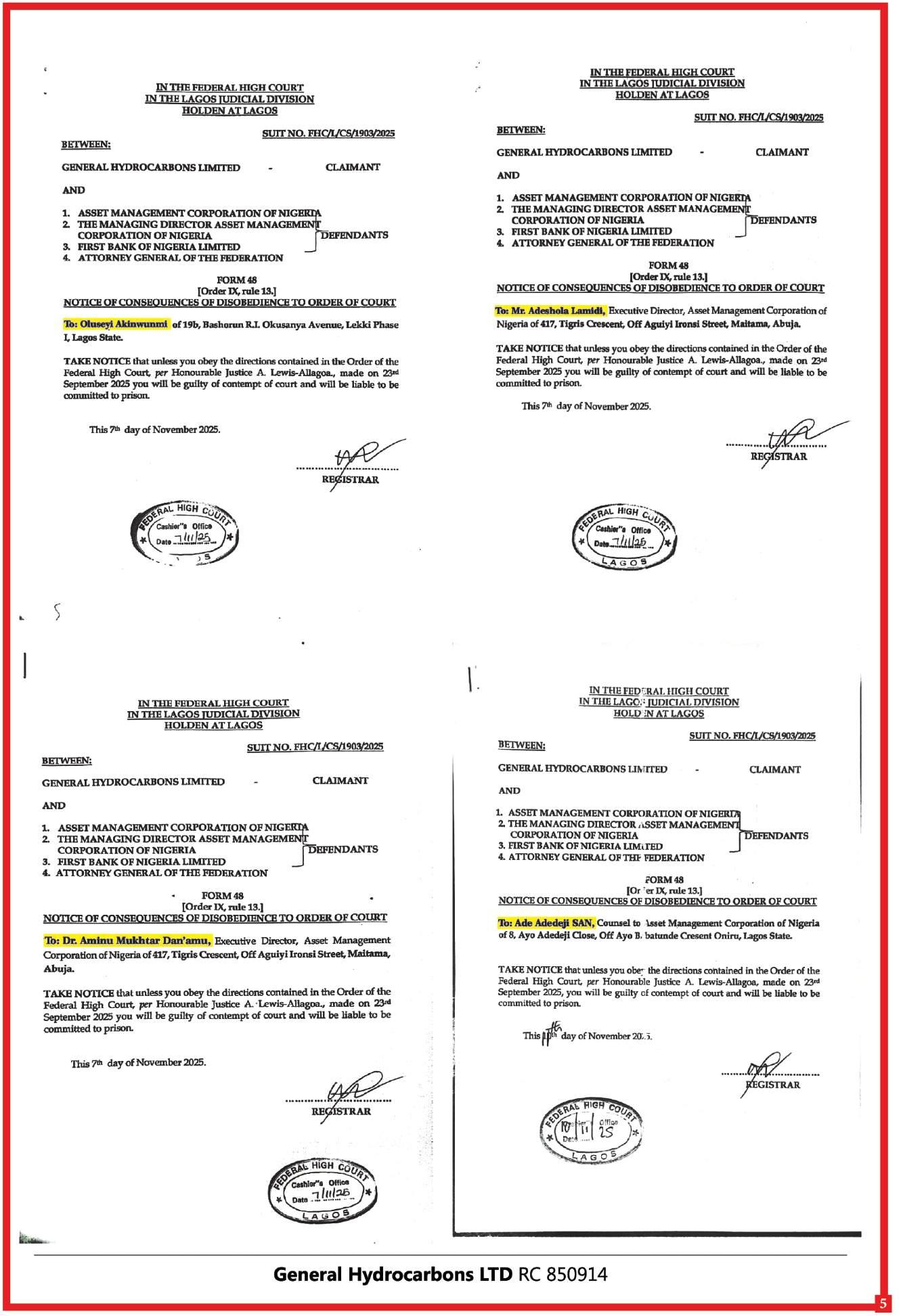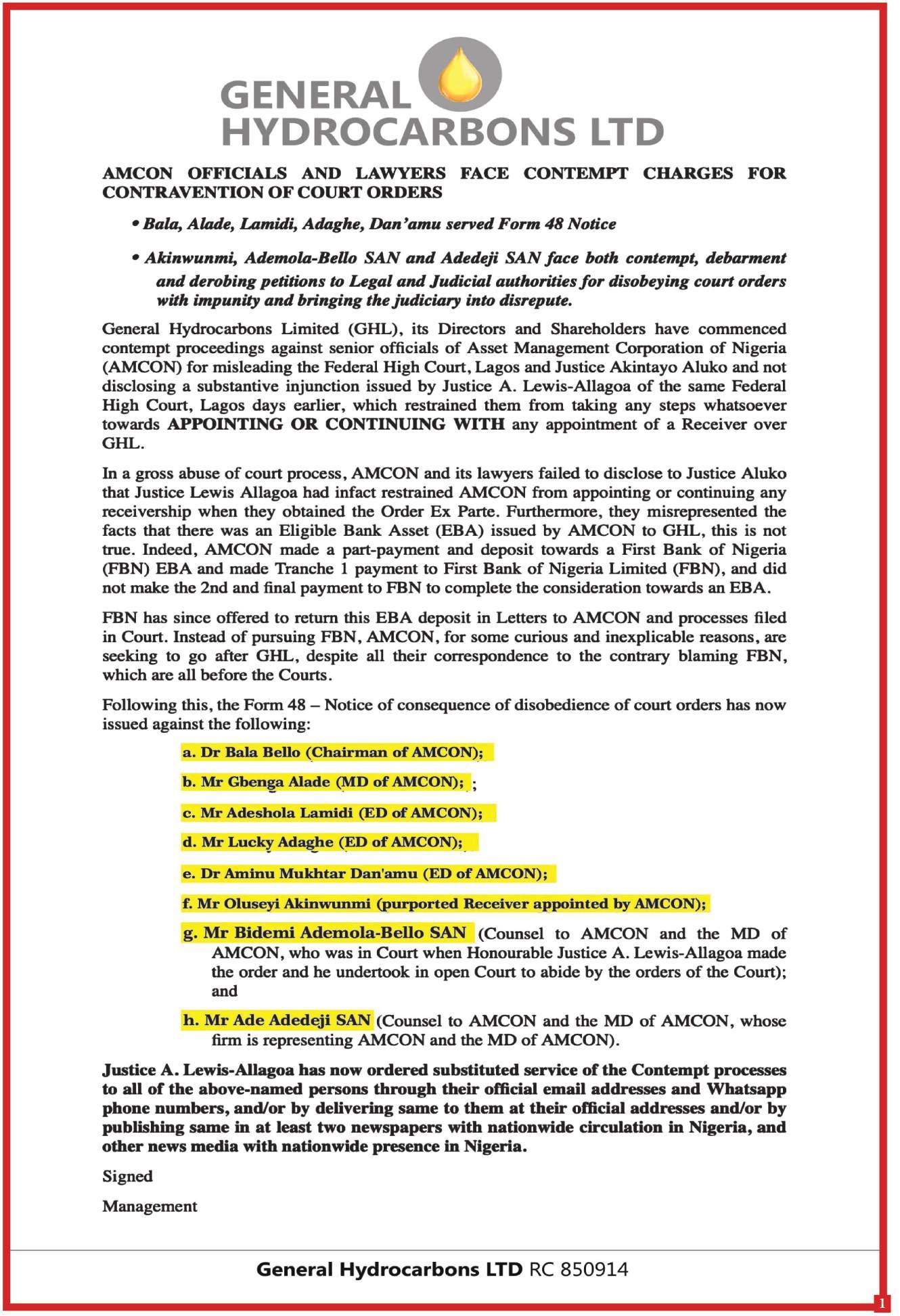 Akinwunmi, Ademola-Bello SAN, Adedeji SAN face contempt, debarment and de-robing petitions to legal and judicial authorities for disobeying court orders with impunity and bringing the judiciary into disrepute General Hydrocarbons Limited (GHL), its Directors, and Shareholders have commenced contempt proceedings against senior officials of Asset Management Corporation of Nigeria (AMCON) for allegedly disobeying a subsisting order of a Federal High Court in Lagos, which restrained them from appointing a Receiver over GHL.