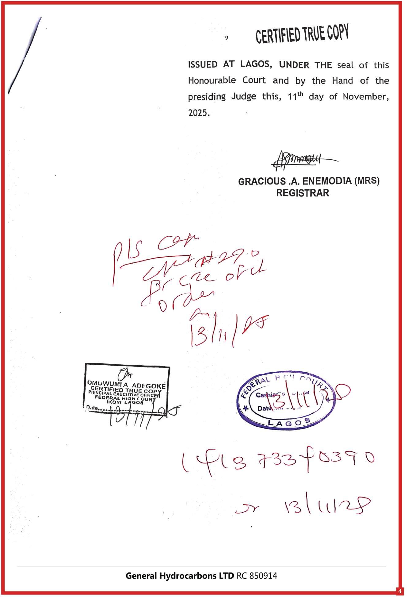 filed by the two subsidiaries of First Bank of Nigeria Plc, freezing the assets of Neconde Energy Limited, Nestoil, and other defendants in the suit
