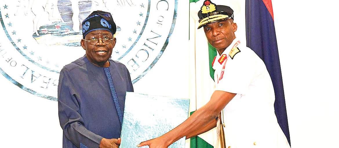 President Bola Ahmed Tinubu (L) receiving copies of a research paper from the representative of the participants on behalf of the Commandant, National War College, Real Admiral A. A. Ahmed, during the presentation by National Defence College (NDC) Course 33, during a visit to the President at the Presidential Villa, Abuja, yesterday