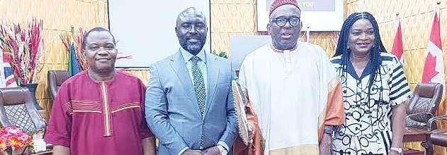 L-R: Commissioner for Works, Enugu State, Engr. Ben Collins Ndu Jr.; Cooperation Attachee, French Embassy, Nigeria, Ketty Regis; Secretary to Enugu State Government, Prof Chidiebere Onyia; Ambassador of France to Nigeria, H.E Marc Fondbaustier; Governor of Enugu State, Dr Peter Mbah; Deputy Country Director, French Development Agency, Mohamasou Diarra; Economic Counsellor, Ms. Emmanuelle Boulestreau and the Project Manager, Water Supply, AFD, Gauvald Dulbecco, during a courtesy visit to Governor Mbah by the Ambassador and development partners at Government House, Enugu.