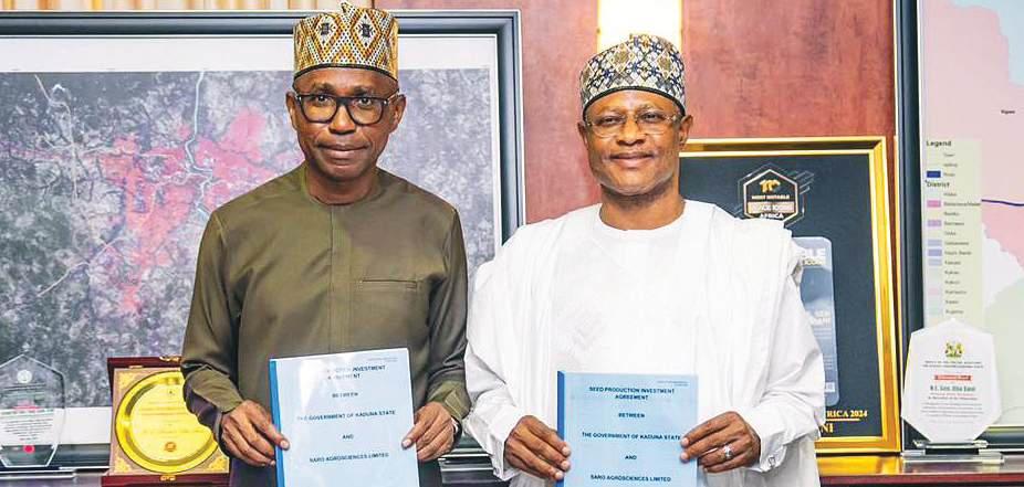 L-R: Group CEO, Saroafrica-SIAT Group, Rasheed Sarumi and the Executive Governor of Kaduna State, His Excellency, Sen. Uba Sani, at the signing ceremony of Saroafrica’s 20 million dollar landmark investment in large scale commercial seed production in Kaduna State to enhance improved seed availability nationwide