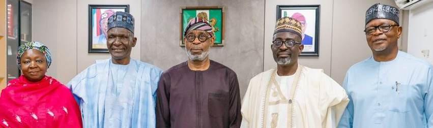 L–R: Executive-Director, Commercial and Industrialisation, North Central Development Commission (NCDC), Hajiya Ramatu Ibrahim; Managing Director, NCDC, Dr. Cyril Tsenyil; Minister of Solid Minerals Development, Mr. Dele Alake; Executive-Director, Finance, NCDC, Prof. Muhammed Bashar Nuhu; and Executive-Director, Corporate Services, NCDC, James Abel Uloko, during a courtesy visit to the Ministry of Solid Minerals Development in Abuja ... recently