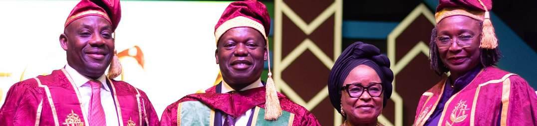 Alausa (FAMedS) CON; Group Chief Executive, Oando PLC, Dr. Jubril Adewale Tinubu CON; Iyalode of Lagos, Alhaja Bintu-Fatima Tinubu; and Vice Chancellor of University of Lagos, Professor Folasade Tolulope Ogunsola OON; at the 56th Convocation Ceremony of the University of Lagos, where Dr. Jubril Adewale Tinubu CON was conferred an honourary doctorate in Lagos.