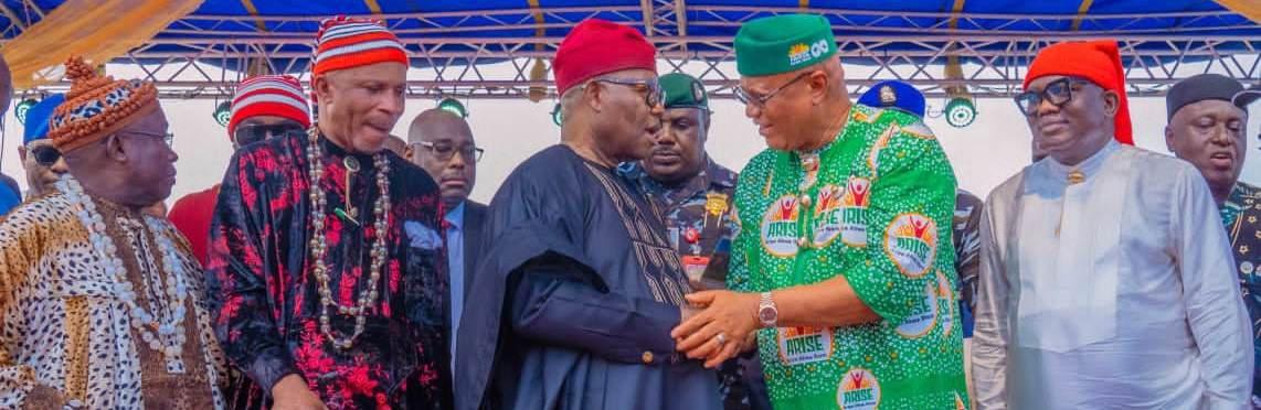L-R: The Paramount Ruler of Oruk Anam LGA, Akuku (Engr) Johnson Johnny Obosi; The Paramount Ruler of Abak and Chairman Akwa Ibom State Supreme Council of Traditional Rulers His Royal Majesty Akuku Saviour Sylvester Udofia; President of the Senate, Godswill Akpabio; Governor of Akwa Ibom State, Pastor Umo Eno and the Executive Director of the Niger Delta Development Commission (NDDC) Dr Victor Antai at a grand rally by Traditional Rulers in Akwa Ibom State to endorse President Tinubu, Akpabio and Governor Eno for reelection in 2027