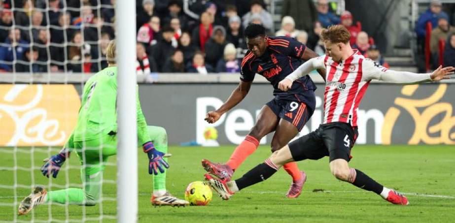 Nottingham Forest’s Taiwo Awoniyi (centre) attempting to shoot as Brentford’s Sepp van den Berg stretches to block him during their English Premier League fixture in Brentford, London...on Sunday afternoon. Forest won the away clash 2-0