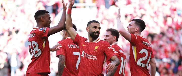 Liverpool stars led by Mohamed Salah (centre) giving each other hi-five for a job well executed to become champions of the English Premier League 2024/2025 season