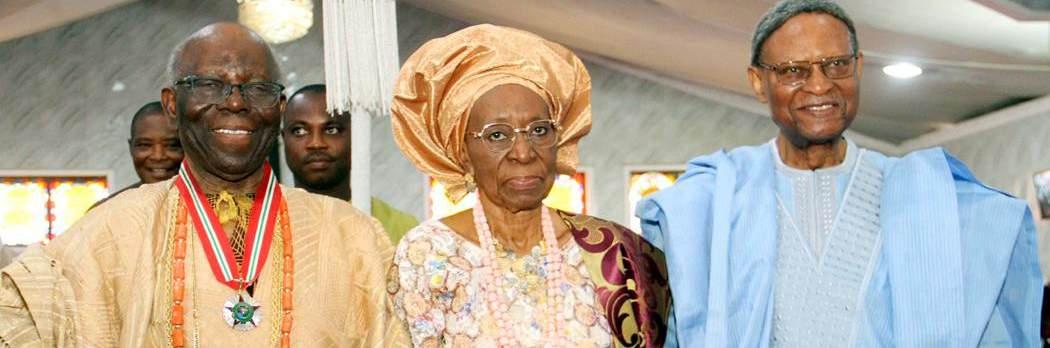 L-R: Celebrant, Chief Olusegun Ladipo Osunkeye; his wife, Abosede Osunkeye and Former Commonwealth Secretary-General, Chief Emeka Anyaoku during the 85th birthday thanksgiving service of Chief Osunkeye at Archbishop Vining Memorial Cathedral, Ikeja, Lagos ... yesterday