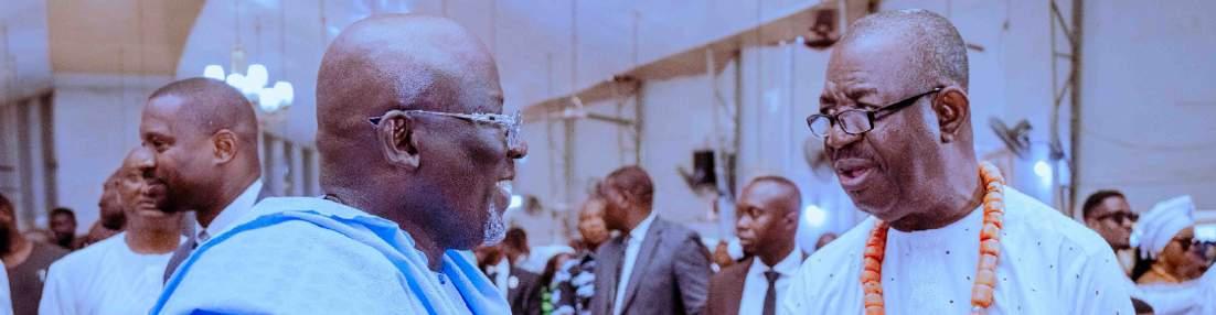 Delta State Governor, Rt. Hon. Sheriff Oborevwori (left), exchanging pleasantries with Agbor-born business mogul and Managing Director, Clarence Land & Marine Services Ltd., Mr. Joey Obue, during Mr. Obue's mother, late Rose Imade’s requeim mass, held at St. John Catholic Church, Agbor...yesterday.