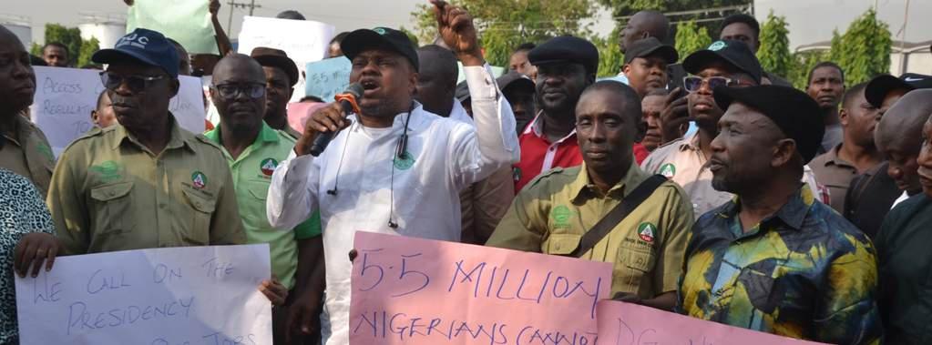Members of Food Beverage and Tobacco Senior Staff Association(FOBTOB) and the National Union of Food Beverage & Tobacco Employees(NUFBTE) during a protest over the ban of alcohol in sachets and below 200ml glass bottles at NAFDAC's office in Lagos...yesterday